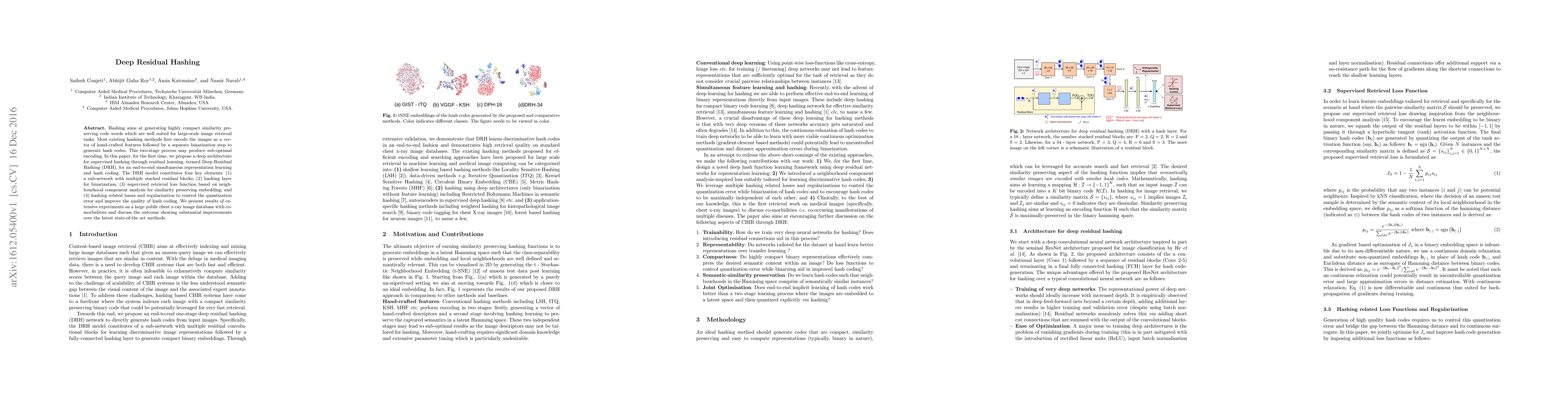 Hashing aims at generating highly compact similarity preserving code words which are well suited for large-scale image retrieval tasks. Most existing hashing methods first encode the images as a vector of hand-crafted features followed by a separate binarization step to generate hash codes. This two-stage process may produce sub-optimal encoding. In this paper, for the first time, we propose a deep architecture for supervised hashing through residual learning, termed Deep Residual Hashing (DRH), for an end-to-end simultaneous representation learning and hash coding. The DRH model constitutes four key elements: (1) a sub-network with multiple stacked residual blocks; (2) hashing layer for binarization; (3) supervised retrieval loss function based on neighbourhood component analysis for similarity preserving embedding; and (4) hashing related losses and regularisation to control the quantization error and improve the quality of hash coding. We present results of extensive experiments on a large public chest x-ray image database with co-morbidities and discuss the outcome showing substantial improvements over the latest state-of-the art methods.