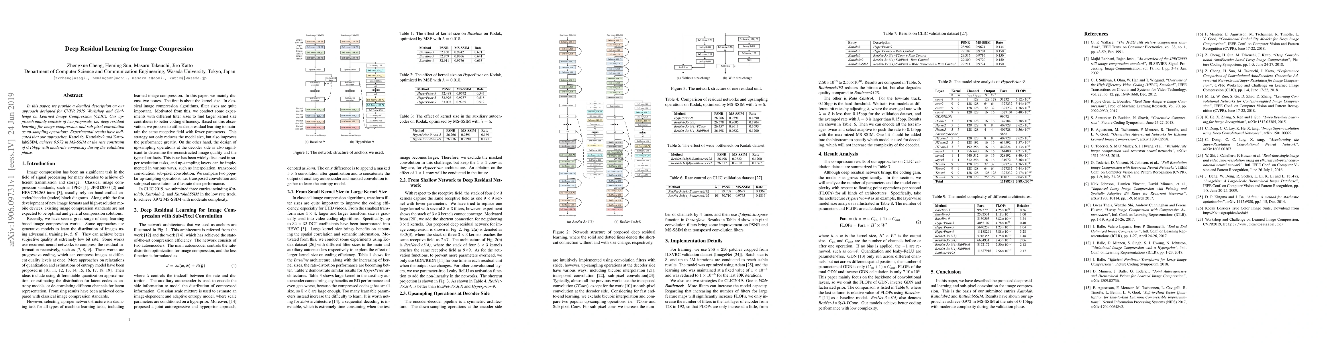 In this paper, we provide a detailed description on our approach designed for CVPR 2019 Workshop and Challenge on Learned Image Compression (CLIC). Our approach mainly consists of two proposals, i.e. deep residual learning for image compression and sub-pixel convolution as up-sampling operations. Experimental results have indicated that our approaches, Kattolab, Kattolabv2 and KattolabSSIM, achieve 0.972 in MS-SSIM at the rate constraint of 0.15bpp with moderate complexity during the validation phase.