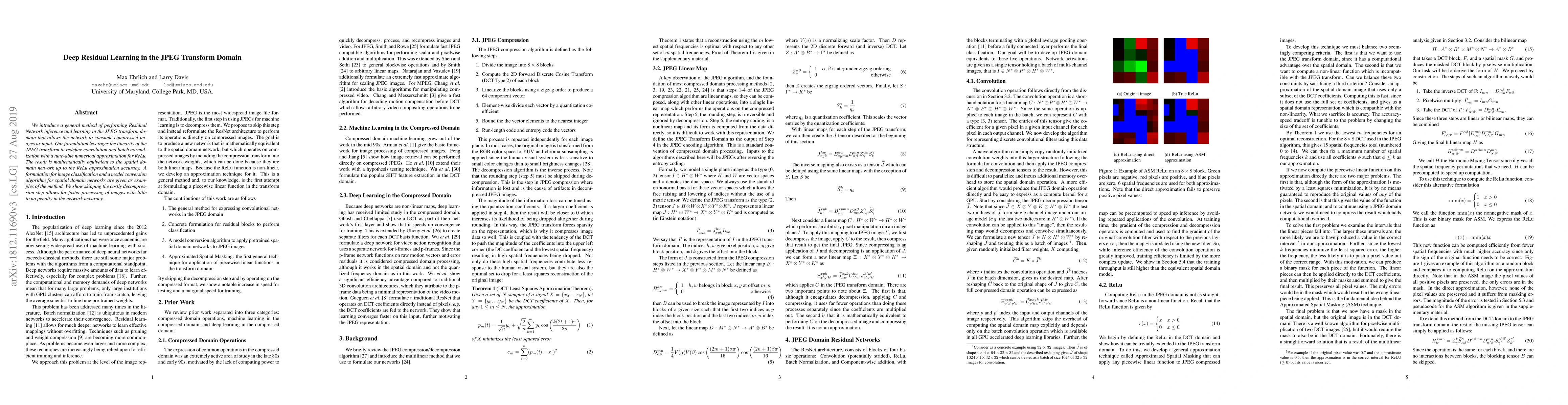 We introduce a general method of performing Residual Network inference and learning in the JPEG transform domain that allows the network to consume compressed images as input. Our formulation leverages the linearity of the JPEG transform to redefine convolution and batch normalization with a tune-able numerical approximation for ReLu. The result is mathematically equivalent to the spatial domain network up to the ReLu approximation accuracy. A formulation for image classification and a model conversion algorithm for spatial domain networks are given as examples of the method. We show that the sparsity of the JPEG format allows for faster processing of images with little to no penalty in the network accuracy.