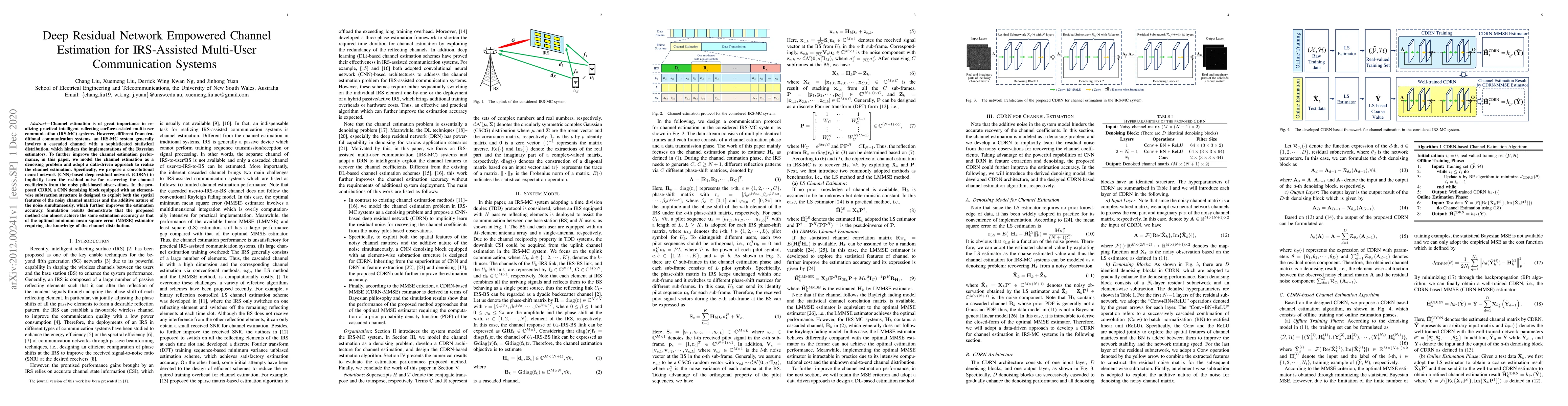 This paper proposes a deep residual network (CDRN) for channel estimation in IRS-assisted multi-user communication systems, modeling the problem as a denoising task. The CDRN leverages a CNN denoising block to enhance estimation accuracy by learning residual noise from noisy pilot observations.