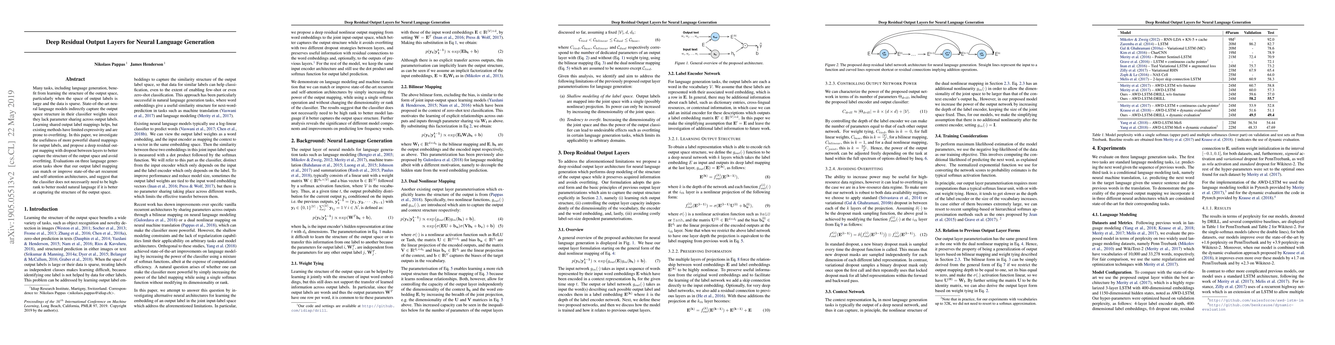 A new neural language generation model uses a deep residual output layer to better capture the structure of the output space, improving performance on tasks with large output labels and sparse data.