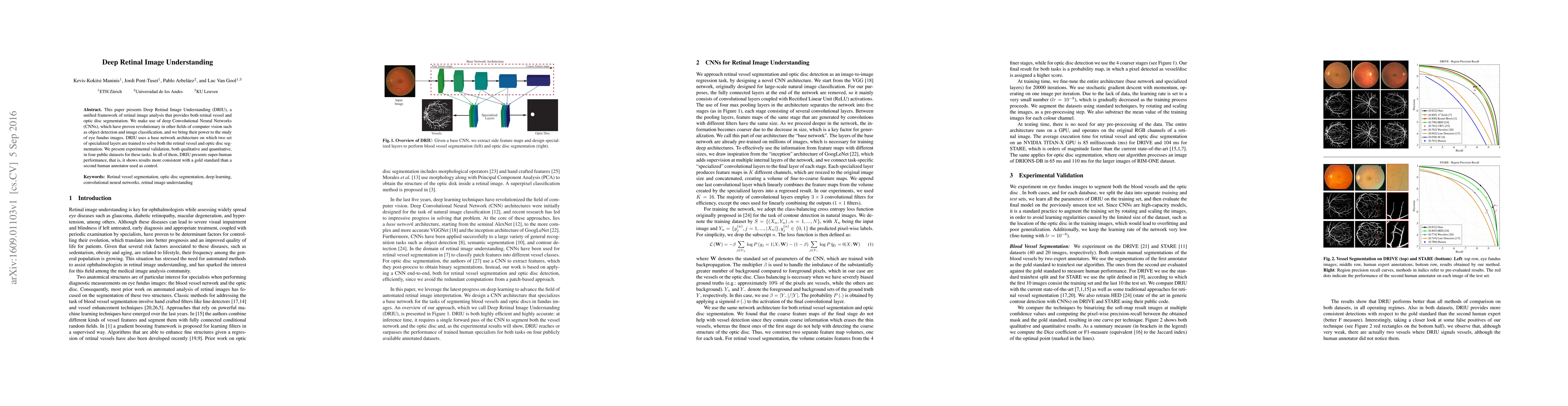 This paper introduces Deep Retinal Image Understanding (DRIU), a framework utilizing deep Convolutional Neural Networks for retinal vessel and optic disc segmentation in eye fundus images, demonstrating superior performance compared to human annotators. Experimental validation across four datasets confirms DRIU's high accuracy and consistency.