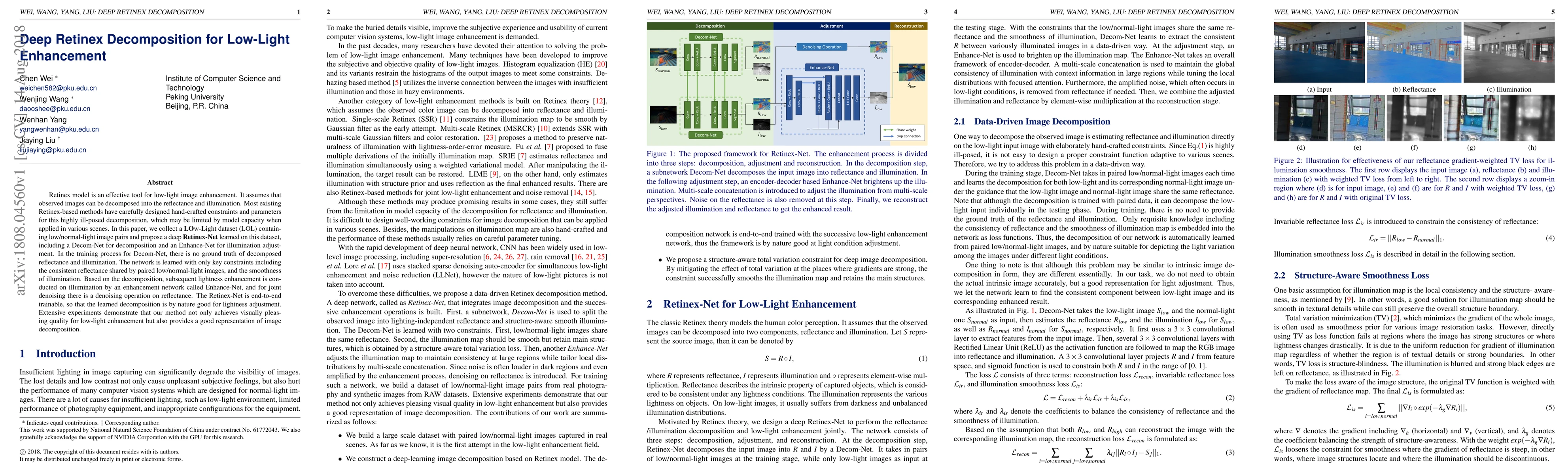This paper introduces a deep Retinex-Net for low-light image enhancement, comprising a Decom-Net for decomposition and an Enhance-Net for illumination adjustment. It trains on a newly collected LOL dataset, using key constraints for decomposition without ground truth, leading to visually effective and representative low-light image enhancement.