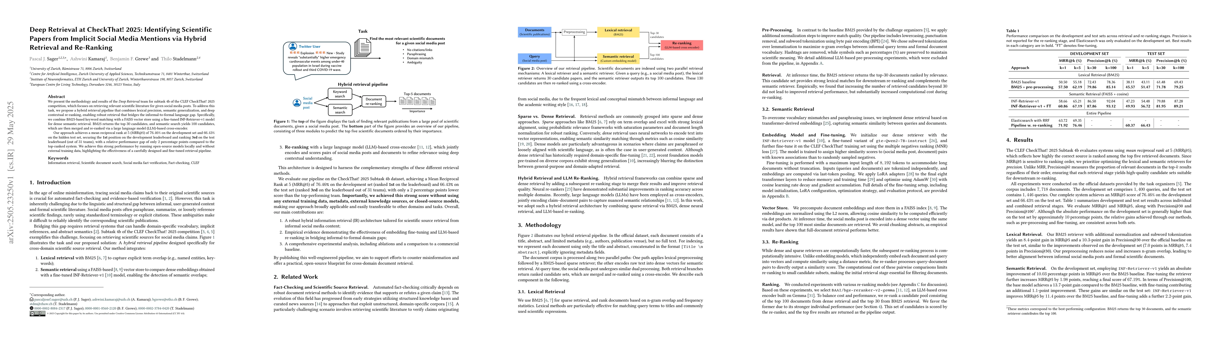 We present the methodology and results of the Deep Retrieval team for subtask 4b of the CLEF CheckThat! 2025 competition, which focuses on retrieving relevant scientific literature for given social media posts. To address this task, we propose a hybrid retrieval pipeline that combines lexical precision, semantic generalization, and deep contextual re-ranking, enabling robust retrieval that bridges the informal-to-formal language gap. Specifically, we combine BM25-based keyword matching with a FAISS vector store using a fine-tuned INF-Retriever-v1 model for dense semantic retrieval. BM25 returns the top 30 candidates, and semantic search yields 100 candidates, which are then merged and re-ranked via a large language model (LLM)-based cross-encoder. Our approach achieves a mean reciprocal rank at 5 (MRR@5) of 76.46% on the development set and 66.43% on the hidden test set, securing the 1st position on the development leaderboard and ranking 3rd on the test leaderboard (out of 31 teams), with a relative performance gap of only 2 percentage points compared to the top-ranked system. We achieve this strong performance by running open-source models locally and without external training data, highlighting the effectiveness of a carefully designed and fine-tuned retrieval pipeline.