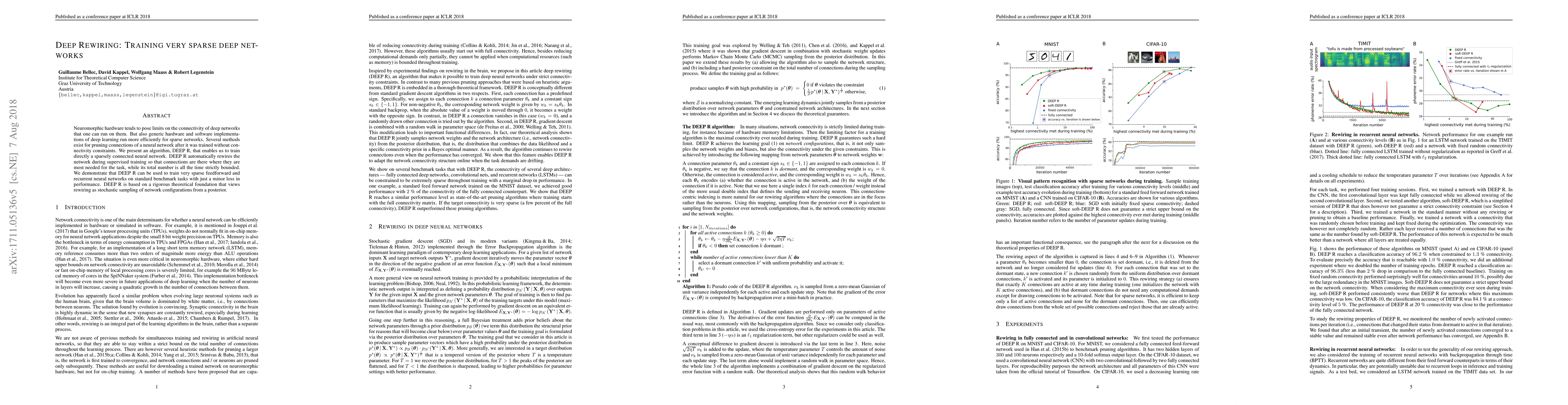 Title: Deep Rewiring: Training very sparse deep networks Summary: The paper introduces DEEP R, an algorithm that trains sparsely connected neural networks directly by dynamically rewiring connections during supervised training, achieving minimal performance loss on standard benchmarks while maintaining hardware efficiency. The method is theoretically grounded in stochastic sampling of network configurations.