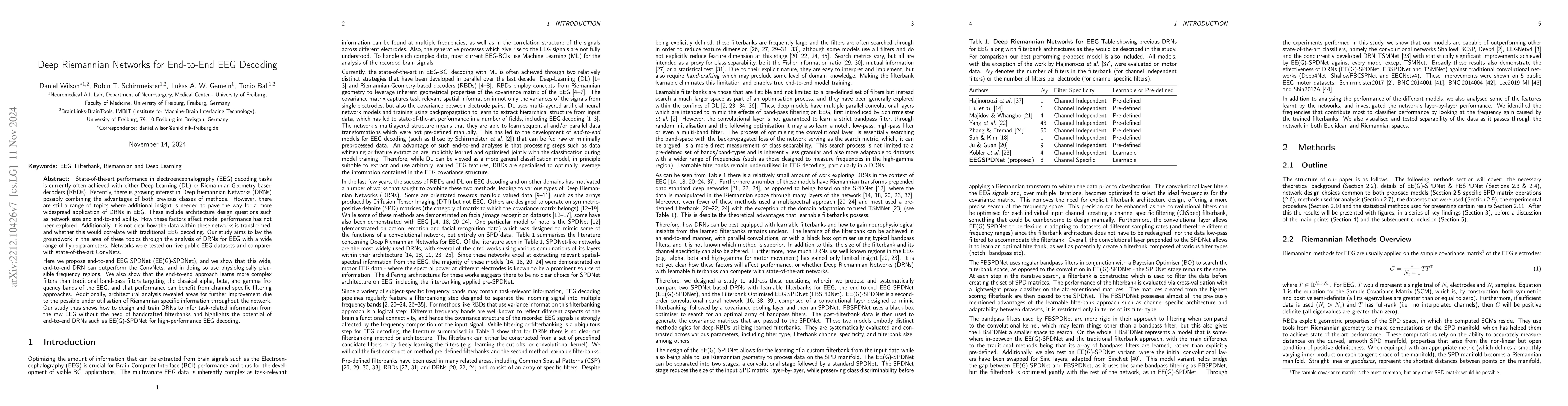 State-of-the-art performance in electroencephalography (EEG) decoding tasks is currently often achieved with either Deep-Learning (DL) or Riemannian-Geometry-based decoders (RBDs). Recently, there is growing interest in Deep Riemannian Networks (DRNs) possibly combining the advantages of both previous classes of methods. However, there are still a range of topics where additional insight is needed to pave the way for a more widespread application of DRNs in EEG. These include architecture design questions such as network size and end-to-end ability.How these factors affect model performance has not been explored. Additionally, it is not clear how the data within these networks is transformed, and whether this would correlate with traditional EEG decoding. Our study aims to lay the groundwork in the area of these topics through the analysis of DRNs for EEG with a wide range of hyperparameters. Networks were tested on two public EEG datasets and compared with state-of-the-art ConvNets. Here we propose end-to-end EEG SPDNet (EE(G)-SPDNet), and we show that this wide, end-to-end DRN can outperform the ConvNets, and in doing so use physiologically plausible frequency regions. We also show that the end-to-end approach learns more complex filters than traditional band-pass filters targeting the classical alpha, beta, and gamma frequency bands of the EEG, and that performance can benefit from channel specific filtering approaches. Additionally, architectural analysis revealed areas for further improvement due to the possible loss of Riemannian specific information throughout the network. Our study thus shows how to design and train DRNs to infer task-related information from the raw EEG without the need of handcrafted filterbanks and highlights the potential of end-to-end DRNs such as EE(G)-SPDNet for high-performance EEG decoding.
