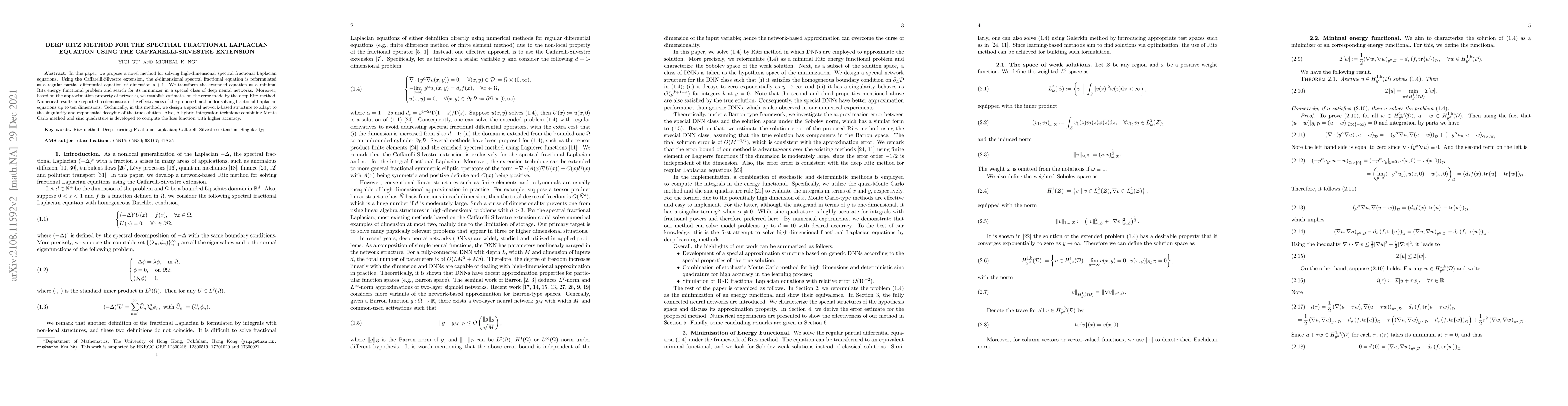 In this paper, we propose a novel method for solving high-dimensional spectral fractional Laplacian equations. Using the Caffarelli-Silvestre extension, the $d$-dimensional spectral fractional equation is reformulated as a regular partial differential equation of dimension $d+1$. We transform the extended equation as a minimal Ritz energy functional problem and search for its minimizer in a special class of deep neural networks. Moreover, based on the approximation property of networks, we establish estimates on the error made by the deep Ritz method. Numerical results are reported to demonstrate the effectiveness of the proposed method for solving fractional Laplacian equations up to ten dimensions. Technically, in this method, we design a special network-based structure to adapt to the singularity and exponential decaying of the true solution. Also, A hybrid integration technique combining Monte Carlo method and sinc quadrature is developed to compute the loss function with higher accuracy.