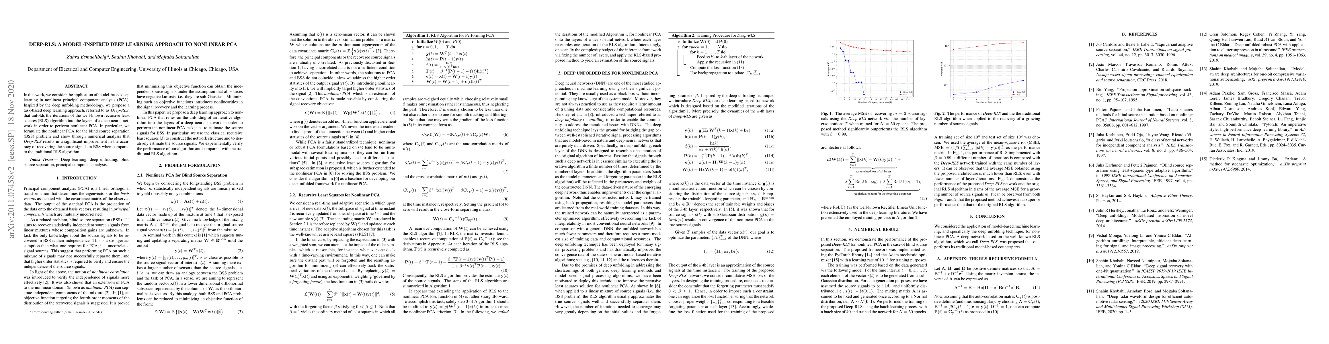 In this work, we consider the application of model-based deep learning in nonlinear principal component analysis (PCA). Inspired by the deep unfolding methodology, we propose a task-based deep learning approach, referred to as Deep-RLS, that unfolds the iterations of the well-known recursive least squares (RLS) algorithm into the layers of a deep neural network in order to perform nonlinear PCA. In particular, we formulate the nonlinear PCA for the blind source separation (BSS) problem and show through numerical analysis that Deep-RLS results in a significant improvement in the accuracy of recovering the source signals in BSS when compared to the traditional RLS algorithm.