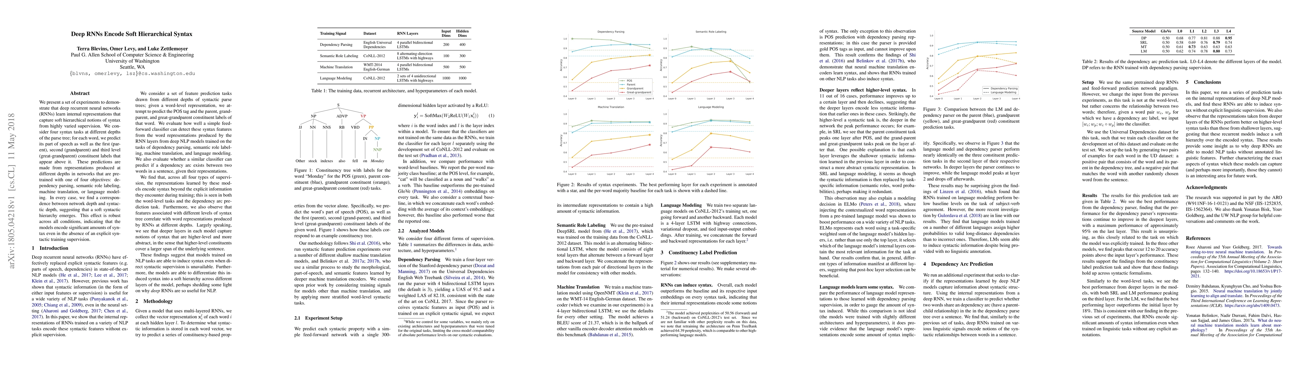 This paper demonstrates that deep RNNs encode soft hierarchical syntax through internal representations learned from varied supervision, showing a correspondence between network depth and syntactic depth across different pretraining tasks. The findings indicate that the models capture syntactic hierarchies even without explicit syntactic training.