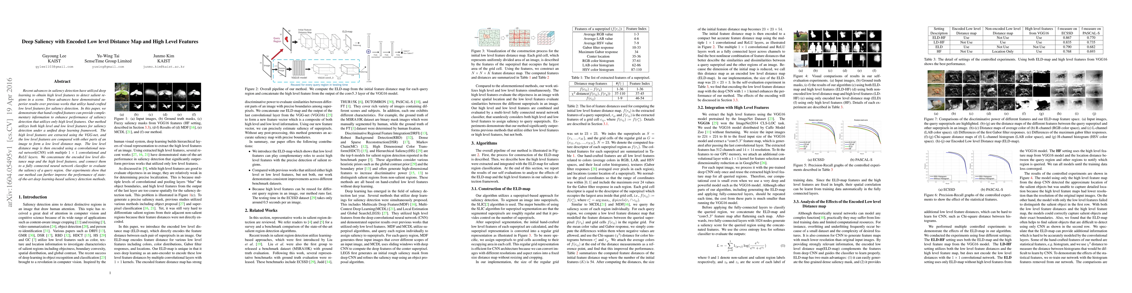 This paper proposes a deep learning method for saliency detection that combines high-level features from VGG-net with encoded low-level distance maps to enhance detection performance. The method shows improved results over state-of-the-art deep learning saliency detection techniques.