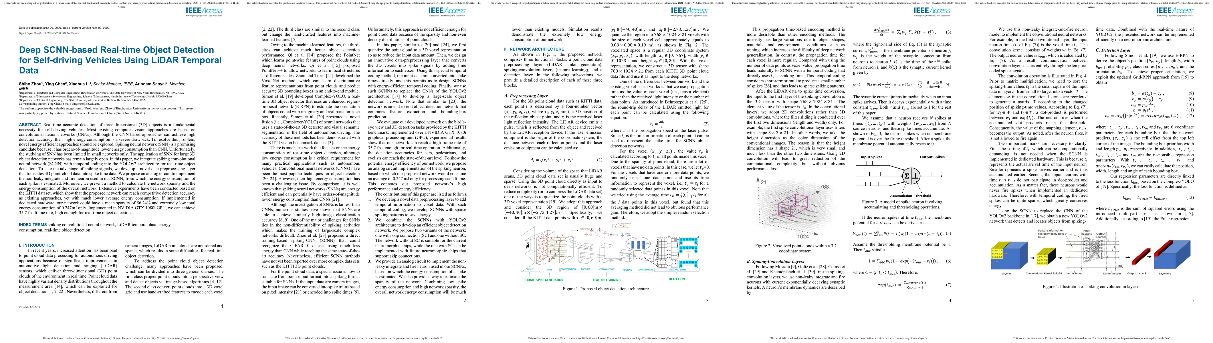 This paper proposes a deep SCNN-based real-time object detection system for self-driving vehicles using LiDAR temporal data, integrating spiking convolutional neural networks (SCNN) with YOLOv2 architecture to achieve low energy consumption while maintaining competitive detection accuracy. Experiments on the KITTI dataset demonstrate significant energy savings and a high frame rate suitable for real-time applications.