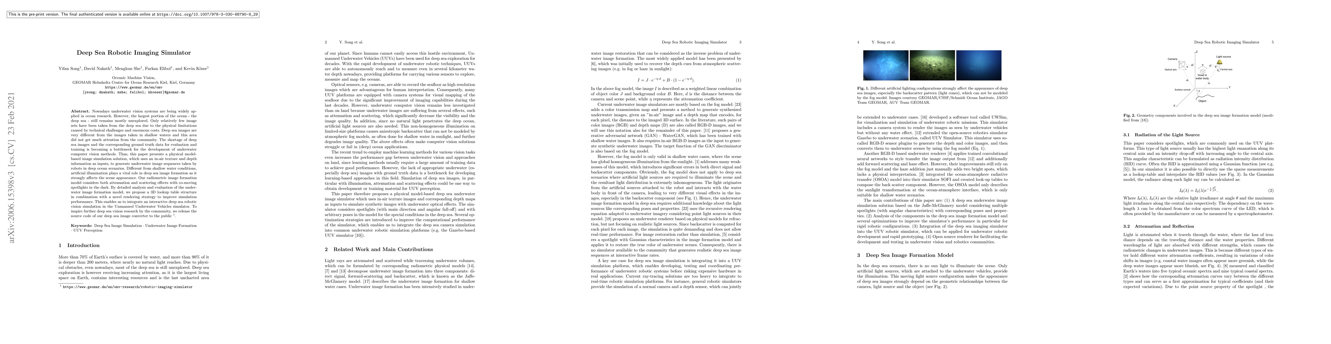 Nowadays underwater vision systems are being widely applied in ocean research. However, the largest portion of the ocean - the deep sea - still remains mostly unexplored. Only relatively few image sets have been taken from the deep sea due to the physical limitations caused by technical challenges and enormous costs. Deep sea images are very different from the images taken in shallow waters and this area did not get much attention from the community. The shortage of deep sea images and the corresponding ground truth data for evaluation and training is becoming a bottleneck for the development of underwater computer vision methods. Thus, this paper presents a physical model-based image simulation solution, which uses an in-air texture and depth information as inputs, to generate underwater image sequences taken by robots in deep ocean scenarios. Different from shallow water conditions, artificial illumination plays a vital role in deep sea image formation as it strongly affects the scene appearance. Our radiometric image formation model considers both attenuation and scattering effects with co-moving spotlights in the dark. By detailed analysis and evaluation of the underwater image formation model, we propose a 3D lookup table structure in combination with a novel rendering strategy to improve simulation performance. This enables us to integrate an interactive deep sea robotic vision simulation in the Unmanned Underwater Vehicles simulator. To inspire further deep sea vision research by the community, we will release the source code of our deep sea image converter to the public.