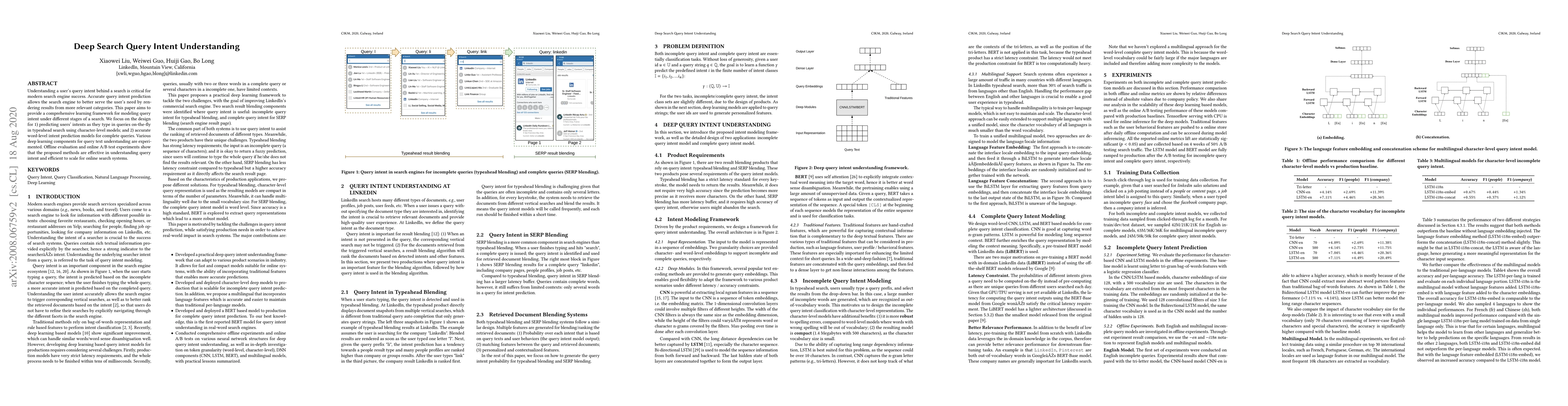 This paper presents a deep learning framework for predicting user search query intent at different stages, including real-time typeahead and complete queries. The proposed methods, evaluated through offline and online tests, demonstrate effectiveness in understanding query intent and scalability for search engines.
