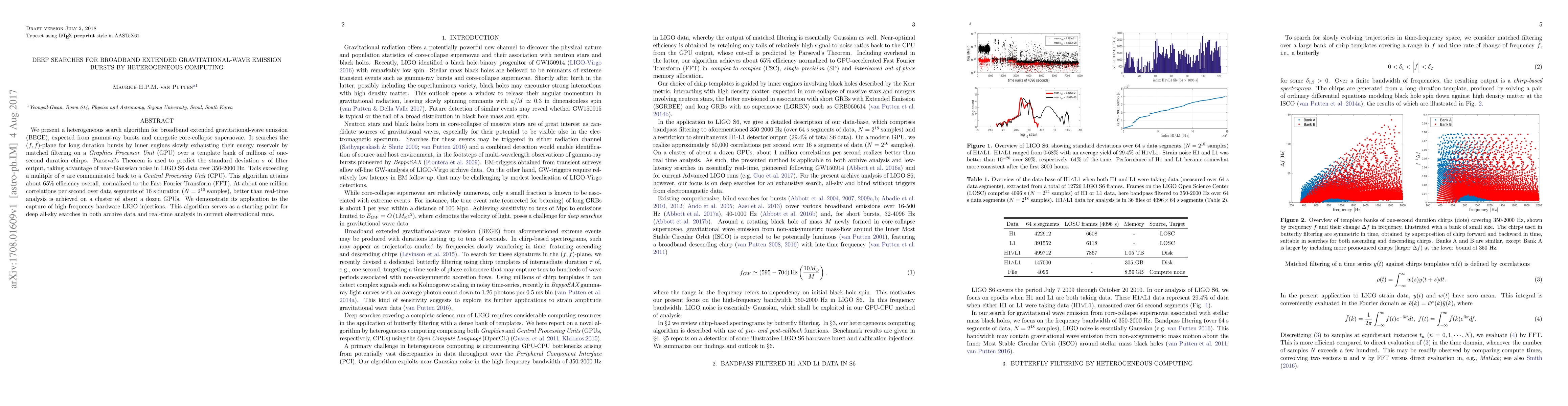 We present a heterogeneous search algorithm for broadband extended gravitational-wave emission (BEGE), expected from gamma-ray bursts and energetic core-collapse supernovae. It searches the $(f,\dot{f})$-plane for long duration bursts by inner engines slowly exhausting their energy reservoir by matched filtering on a {\em Graphics Processor Unit} (GPU) over a template bank of millions of one-second duration chirps. Parseval's Theorem is used to predict the standard deviation $\sigma$ of filter output, taking advantage of near-Gaussian noise in LIGO S6 data over 350-2000 Hz. Tails exceeding a mulitple of $\sigma$ are communicated back to a {\em Central Processing Unit} (CPU). This algorithm attains about 65\% efficiency overall, normalized to the Fast Fourier Transform (FFT). At about one million correlations per second over data segments of 16 s duration $(N=2^{16}$ samples), better than real-time analysis is achieved on a cluster of about a dozen GPUs. We demonstrate its application to the capture of high frequency hardware LIGO injections. This algorithm serves as a starting point for deep all-sky searches in both archive data and real-time analysis in current observational runs.