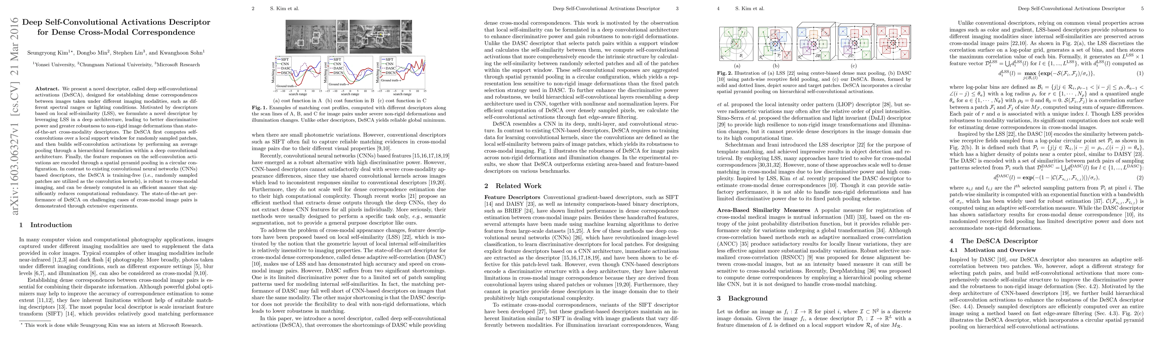 The paper introduces DeSCA, a novel descriptor for dense correspondences between images from different modalities, leveraging deep self-convolutional activations for enhanced discriminative power and robustness. Unlike existing CNN-based descriptors, DeSCA is training-free and efficiently computes features through self-convolutions and spatial pyramid pooling.