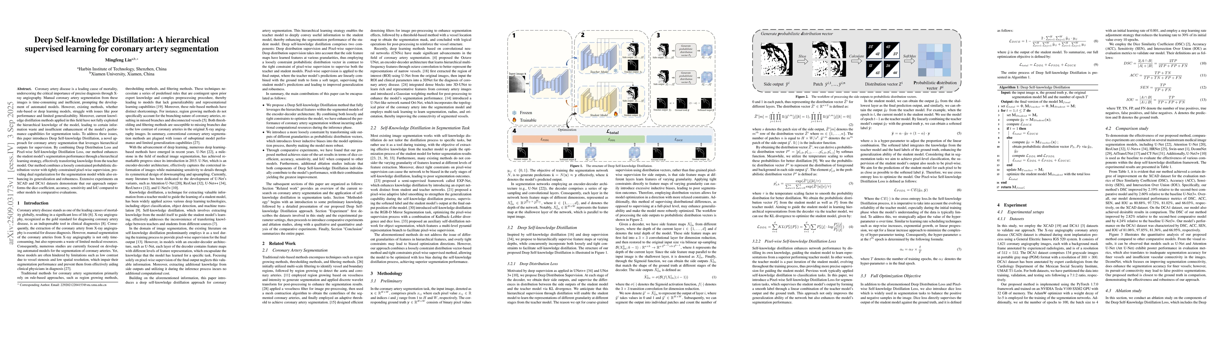 Coronary artery disease is a leading cause of mortality, underscoring the critical importance of precise diagnosis through X-ray angiography. Manual coronary artery segmentation from these images is time-consuming and inefficient, prompting the development of automated models. However, existing methods, whether rule-based or deep learning models, struggle with issues like poor performance and limited generalizability. Moreover, current knowledge distillation methods applied in this field have not fully exploited the hierarchical knowledge of the model, leading to certain information waste and insufficient enhancement of the model's performance capabilities for segmentation tasks. To address these issues, this paper introduces Deep Self-knowledge Distillation, a novel approach for coronary artery segmentation that leverages hierarchical outputs for supervision. By combining Deep Distribution Loss and Pixel-wise Self-knowledge Distillation Loss, our method enhances the student model's segmentation performance through a hierarchical learning strategy, effectively transferring knowledge from the teacher model. Our method combines a loosely constrained probabilistic distribution vector with tightly constrained pixel-wise supervision, providing dual regularization for the segmentation model while also enhancing its generalization and robustness. Extensive experiments on XCAD and DCA1 datasets demonstrate that our approach outperforms the dice coefficient, accuracy, sensitivity and IoU compared to other models in comparative evaluations.