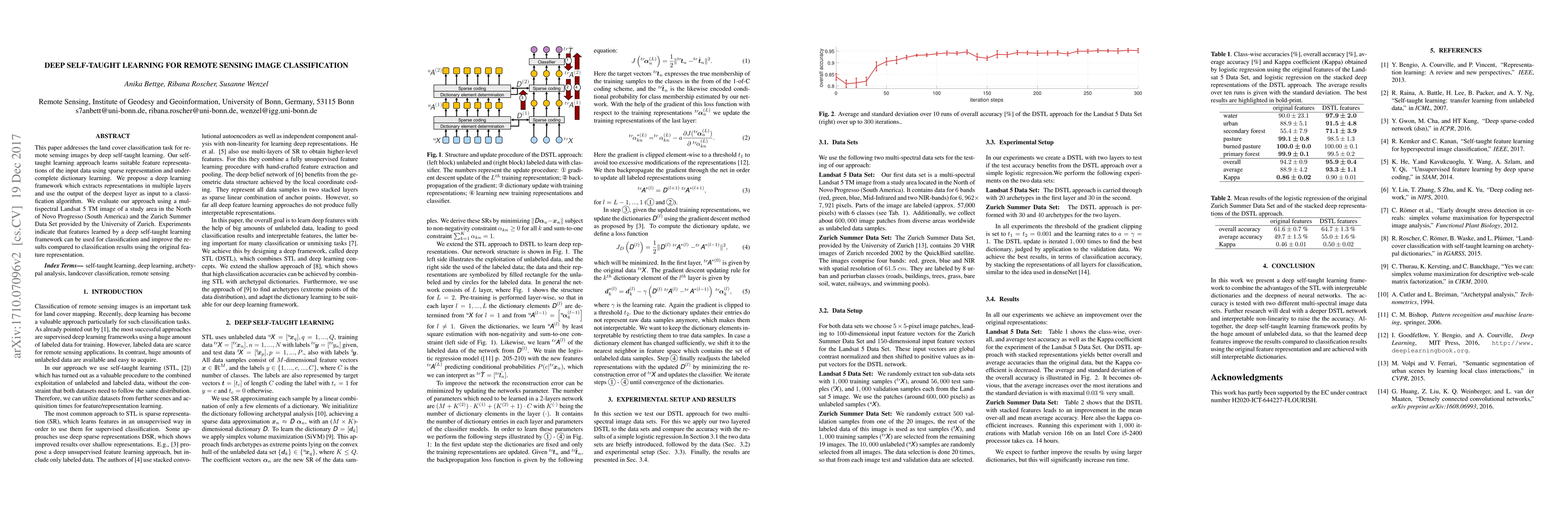 This paper proposes a deep self-taught learning framework for remote sensing image classification, utilizing sparse representation and dictionary learning to extract multi-layer features. Experiments show that the learned features improve classification results over original representations, demonstrated on Landsat 5 TM and Zurich Summer datasets.