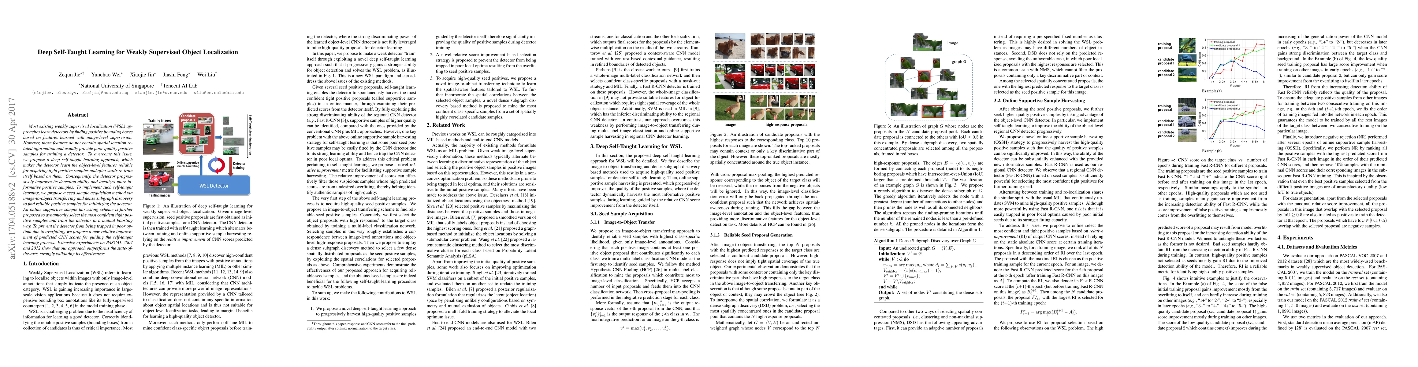 This research introduces a deep self-taught learning method for improving weakly supervised object localization. It aims to address the limitation of existing WSL approaches by progressively refining the detector through the acquisition of reliable positive samples, ultimately enhancing detection accuracy. The proposed method includes a seed sample acquisition technique and an online sample harvesting scheme, demonstrating superior performance on PASCAL datasets.