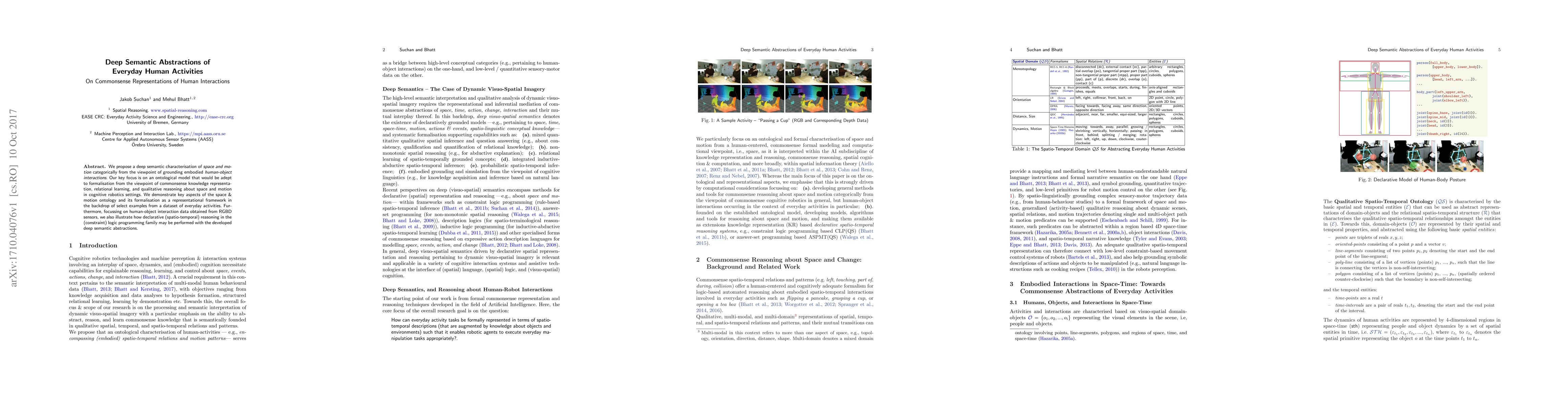 This paper proposes a deep semantic model for categorizing space and motion in human-object interactions, aiming at formalizing commonsense knowledge for cognitive robotics. It demonstrates the ontology's application in reasoning about everyday activities using spatio-temporal logic programming.