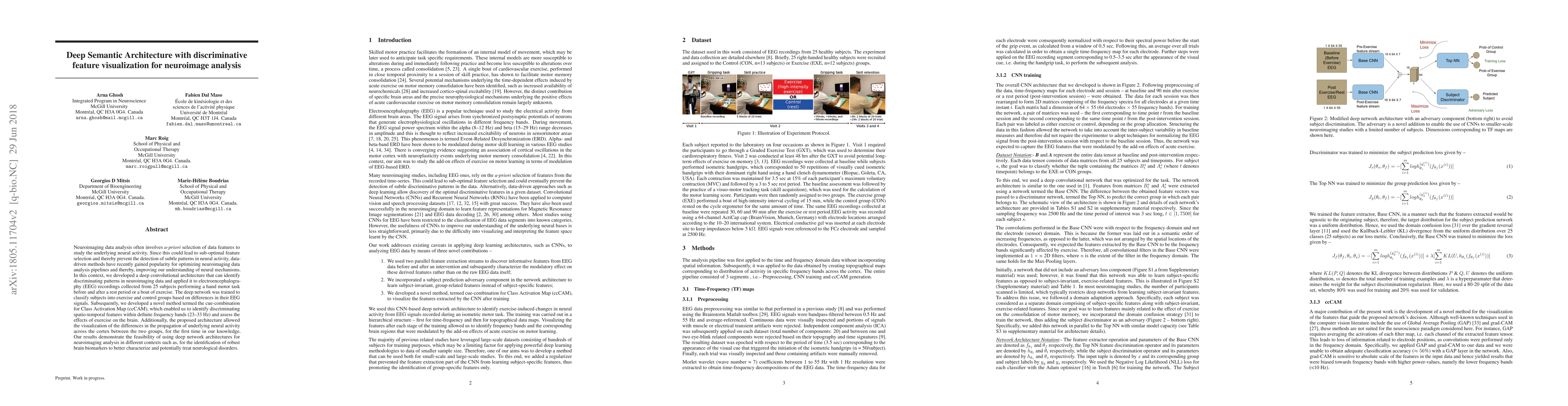 Neuroimaging data analysis often involves \emph{a-priori} selection of data features to study the underlying neural activity. Since this could lead to sub-optimal feature selection and thereby prevent the detection of subtle patterns in neural activity, data-driven methods have recently gained popularity for optimizing neuroimaging data analysis pipelines and thereby, improving our understanding of neural mechanisms. In this context, we developed a deep convolutional architecture that can identify discriminating patterns in neuroimaging data and applied it to electroencephalography (EEG) recordings collected from 25 subjects performing a hand motor task before and after a rest period or a bout of exercise. The deep network was trained to classify subjects into exercise and control groups based on differences in their EEG signals. Subsequently, we developed a novel method termed the cue-combination for Class Activation Map (ccCAM), which enabled us to identify discriminating spatio-temporal features within definite frequency bands (23--33 Hz) and assess the effects of exercise on the brain. Additionally, the proposed architecture allowed the visualization of the differences in the propagation of underlying neural activity across the cortex between the two groups, for the first time in our knowledge. Our results demonstrate the feasibility of using deep network architectures for neuroimaging analysis in different contexts such as, for the identification of robust brain biomarkers to better characterize and potentially treat neurological disorders.