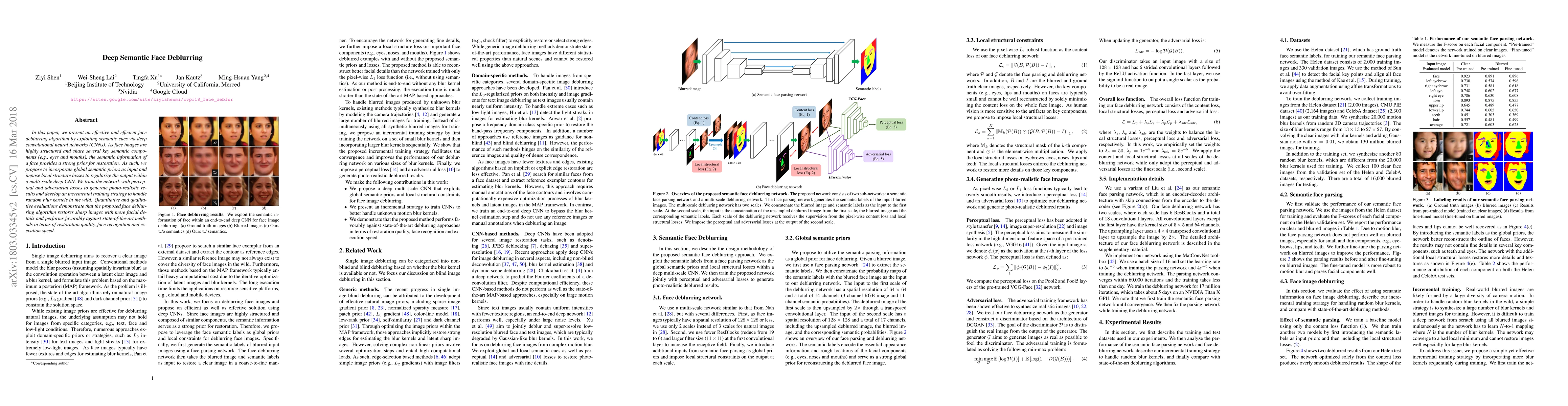 This paper proposes a deep convolutional neural network for face deblurring that leverages semantic information to restore sharp images with enhanced facial details. The method incorporates global semantic priors and local structure losses, achieving superior performance compared to state-of-the-art techniques in terms of image quality, face recognition, and speed.