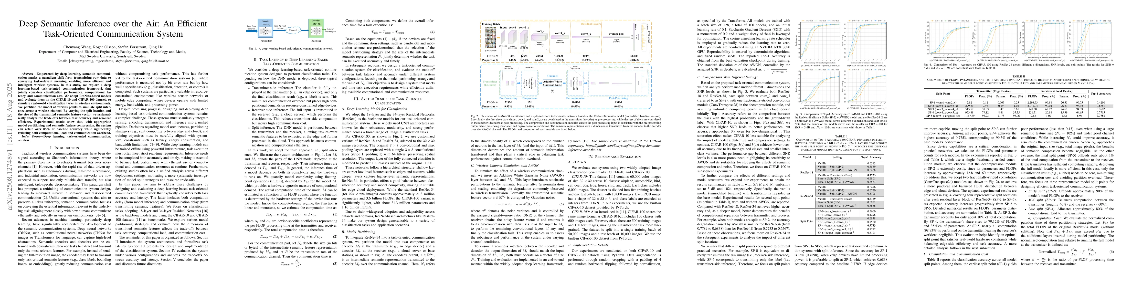 Empowered by deep learning, semantic communication marks a paradigm shift from transmitting raw data to conveying task-relevant meaning, enabling more efficient and intelligent wireless systems. In this study, we explore a deep learning-based task-oriented communication framework that jointly considers classification performance, computational latency, and communication cost. We adopt ResNets-based models and evaluate them on the CIFAR-10 and CIFAR-100 datasets to simulate real-world classification tasks in wireless environments. We partition the model at various points to simulate split inference across a wireless channel. By varying the split location and the size of the transmitted semantic feature vector, we systematically analyze the trade-offs between task accuracy and resource efficiency. Experimental results show that, with appropriate model partitioning and semantic feature compression, the system can retain over 85\% of baseline accuracy while significantly reducing both computational load and communication overhead.