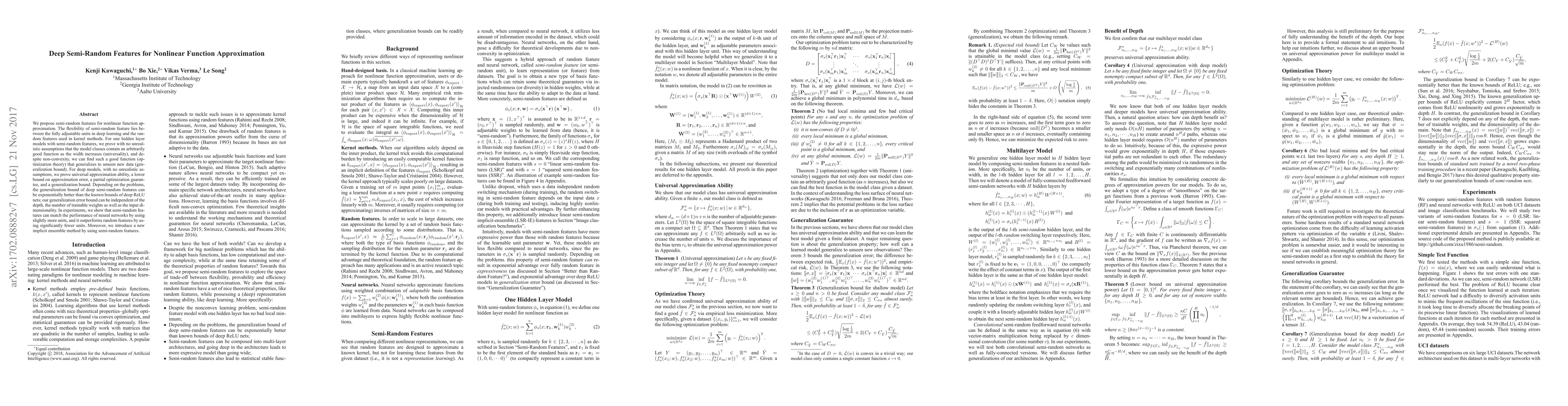 This paper proposes semi-random features for nonlinear function approximation, demonstrating their universality, optimization, and generalization properties for both one-layer and deep models. Experimentally, semi-random features match neural network performance with fewer units and introduce an effective implicit ensemble method.