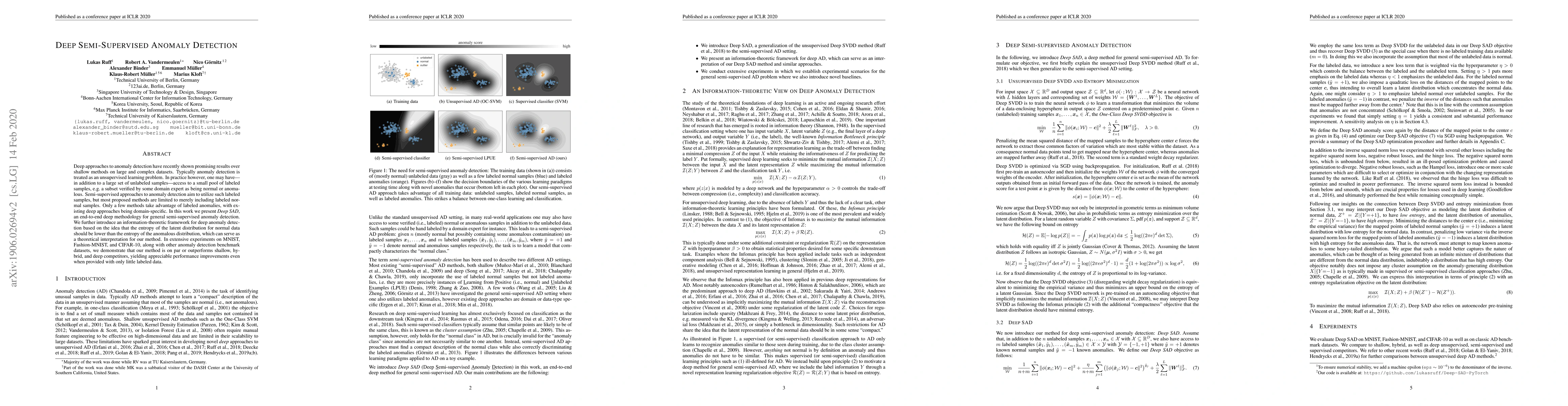 Deep approaches to anomaly detection have recently shown promising results over shallow methods on large and complex datasets. Typically anomaly detection is treated as an unsupervised learning problem. In practice however, one may have---in addition to a large set of unlabeled samples---access to a small pool of labeled samples, e.g. a subset verified by some domain expert as being normal or anomalous. Semi-supervised approaches to anomaly detection aim to utilize such labeled samples, but most proposed methods are limited to merely including labeled normal samples. Only a few methods take advantage of labeled anomalies, with existing deep approaches being domain-specific. In this work we present Deep SAD, an end-to-end deep methodology for general semi-supervised anomaly detection. We further introduce an information-theoretic framework for deep anomaly detection based on the idea that the entropy of the latent distribution for normal data should be lower than the entropy of the anomalous distribution, which can serve as a theoretical interpretation for our method. In extensive experiments on MNIST, Fashion-MNIST, and CIFAR-10, along with other anomaly detection benchmark datasets, we demonstrate that our method is on par or outperforms shallow, hybrid, and deep competitors, yielding appreciable performance improvements even when provided with only little labeled data.