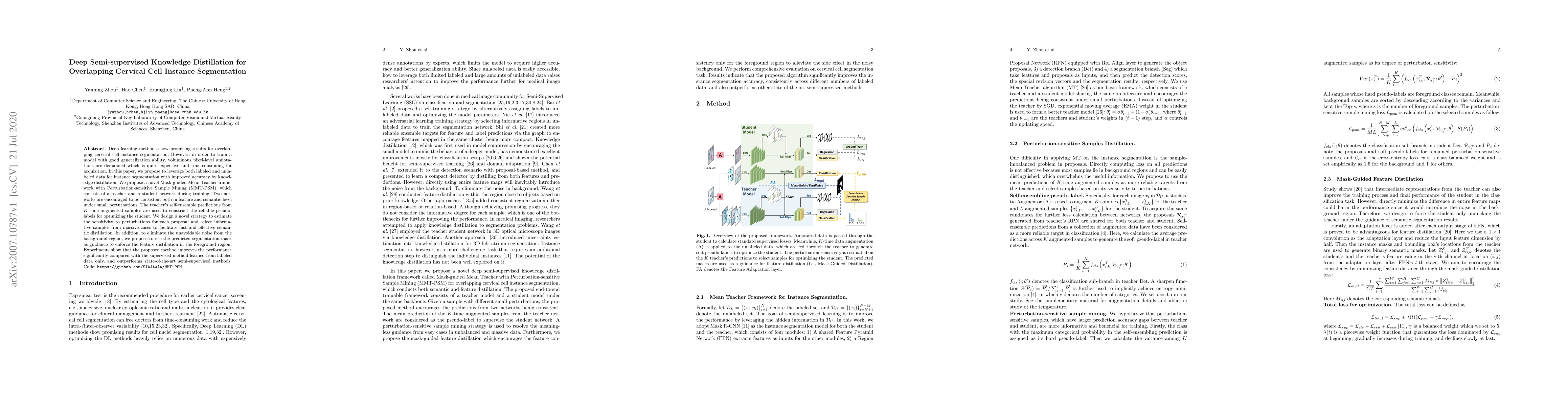This paper proposes a deep semi-supervised knowledge distillation method for cervical cell instance segmentation, utilizing both labeled and unlabeled data to improve accuracy. The Mask-guided Mean Teacher framework with Perturbation-sensitive Sample Mining (MMT-PSM) leverages teacher-student networks and pseudo-labels to enhance generalization, achieving superior performance over supervised and other semi-supervised methods.