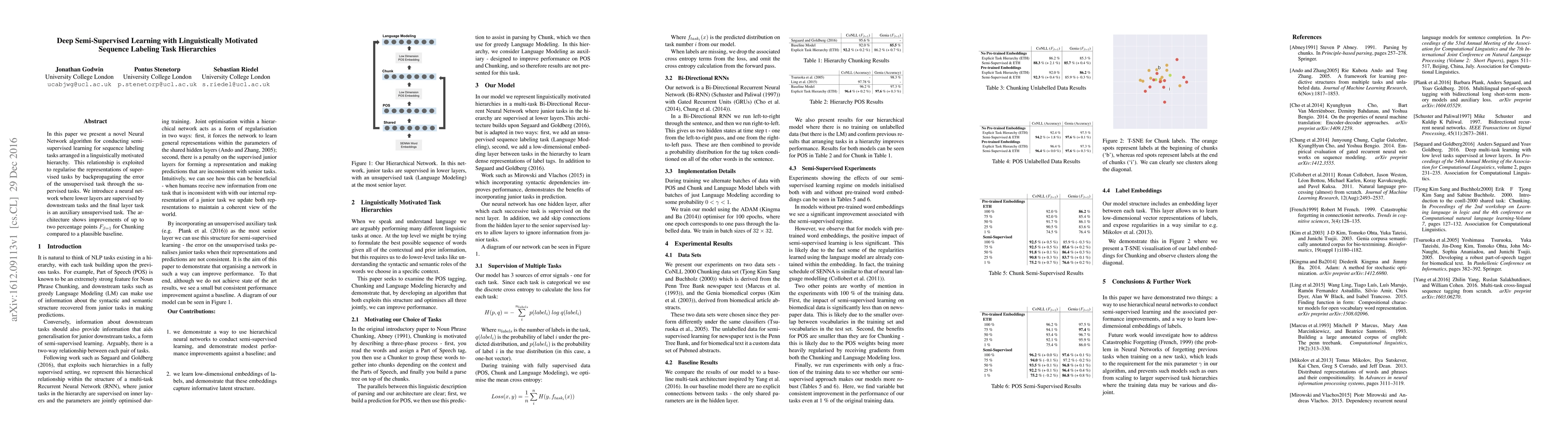 This paper proposes a neural network algorithm for semi-supervised learning in sequence labeling tasks organized in a linguistically motivated hierarchy. It improves F1 scores by up to two percentage points for Chunking through backpropagating error from unsupervised to supervised tasks.