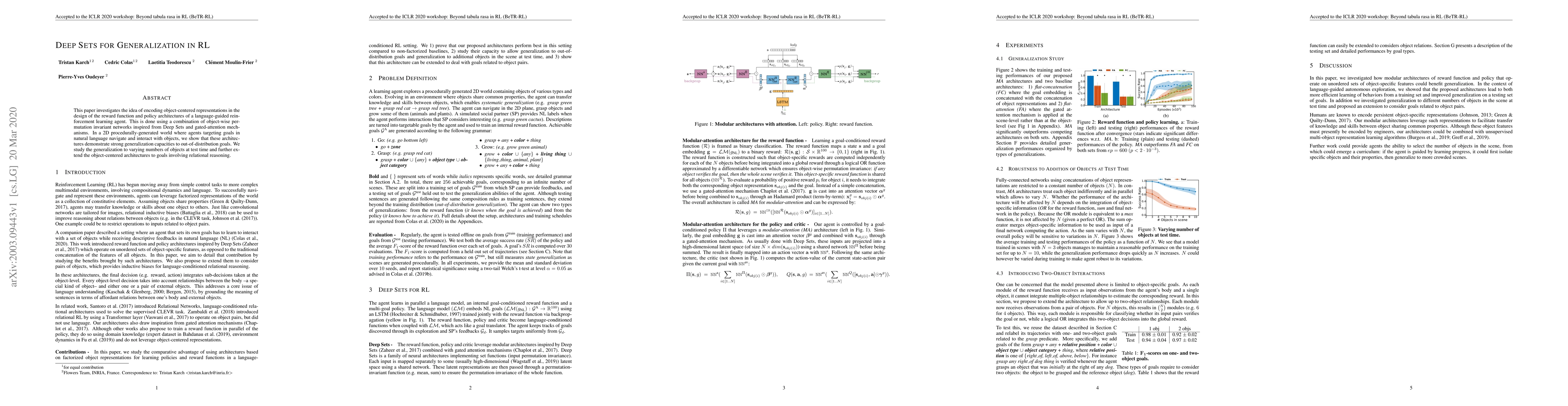 This paper investigates the idea of encoding object-centered representations in the design of the reward function and policy architectures of a language-guided reinforcement learning agent. This is done using a combination of object-wise permutation invariant networks inspired from Deep Sets and gated-attention mechanisms. In a 2D procedurally-generated world where agents targeting goals in natural language navigate and interact with objects, we show that these architectures demonstrate strong generalization capacities to out-of-distribution goals. We study the generalization to varying numbers of objects at test time and further extend the object-centered architectures to goals involving relational reasoning.