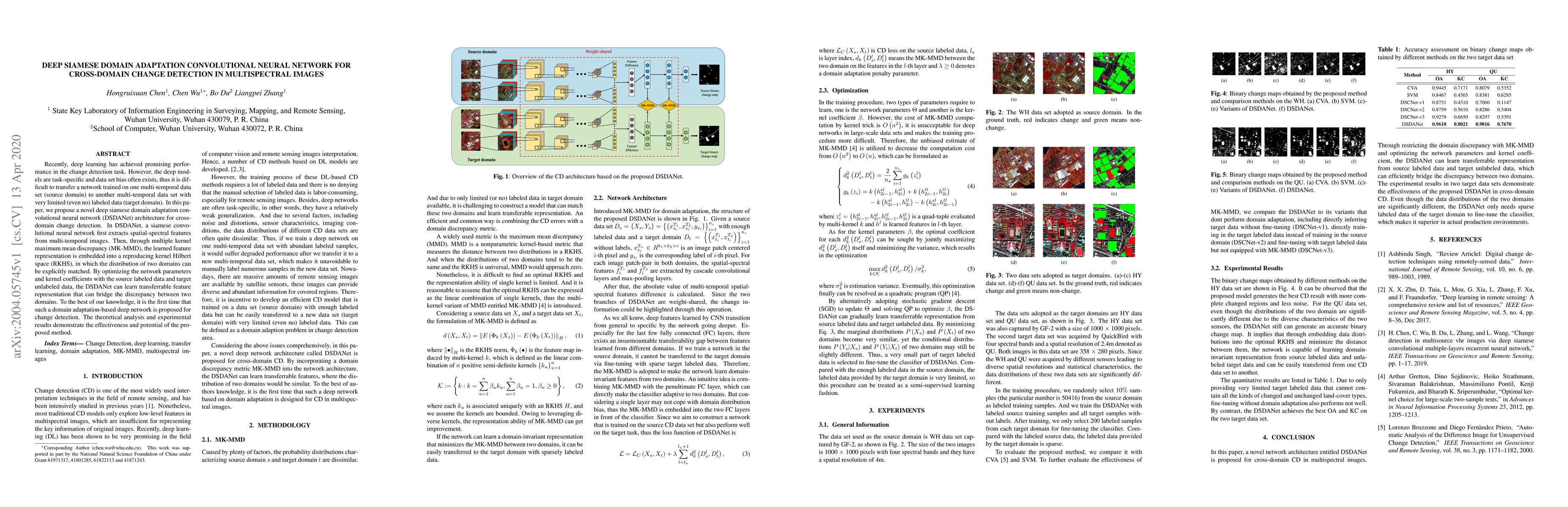 This paper proposes a novel deep siamese domain adaptation convolutional neural network (DSDANet) for cross-domain change detection in multispectral images, utilizing a siamese CNN for feature extraction and MK-MMD to match domain distributions, demonstrating effective transfer learning between labeled and unlabeled datasets.