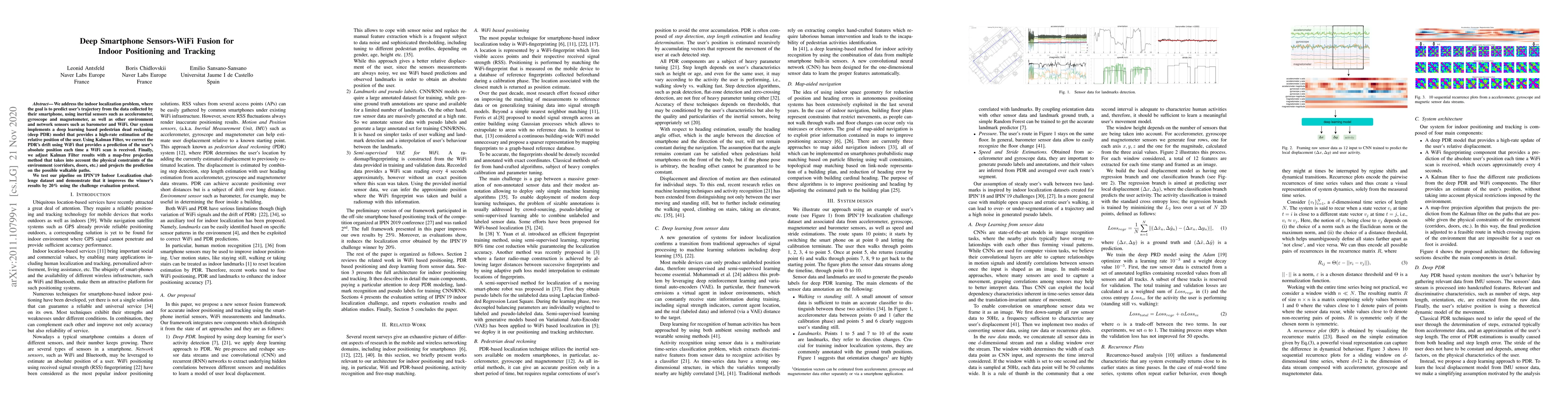 We address the indoor localization problem, where the goal is to predict user's trajectory from the data collected by their smartphone, using inertial sensors such as accelerometer, gyroscope and magnetometer, as well as other environment and network sensors such as barometer and WiFi. Our system implements a deep learning based pedestrian dead reckoning (deep PDR) model that provides a high-rate estimation of the relative position of the user. Using Kalman Filter, we correct the PDR's drift using WiFi that provides a prediction of the user's absolute position each time a WiFi scan is received. Finally, we adjust Kalman Filter results with a map-free projection method that takes into account the physical constraints of the environment (corridors, doors, etc.) and projects the prediction on the possible walkable paths. We test our pipeline on IPIN'19 Indoor Localization challenge dataset and demonstrate that it improves the winner's results by 20\% using the challenge evaluation protocol.