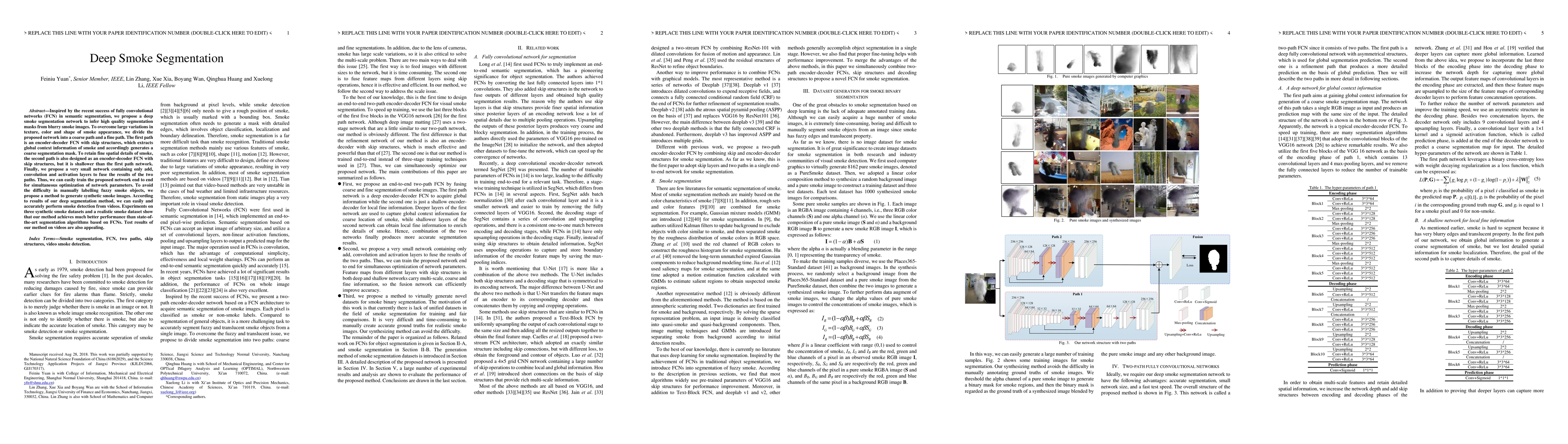 This paper proposes a deep smoke segmentation network using fully convolutional networks to generate high-quality masks from blurry smoke images. It employs a dual-path architecture to capture both coarse and fine details, and synthetic smoke images are used to alleviate labeling difficulties, achieving superior performance compared to state-of-the-art methods.