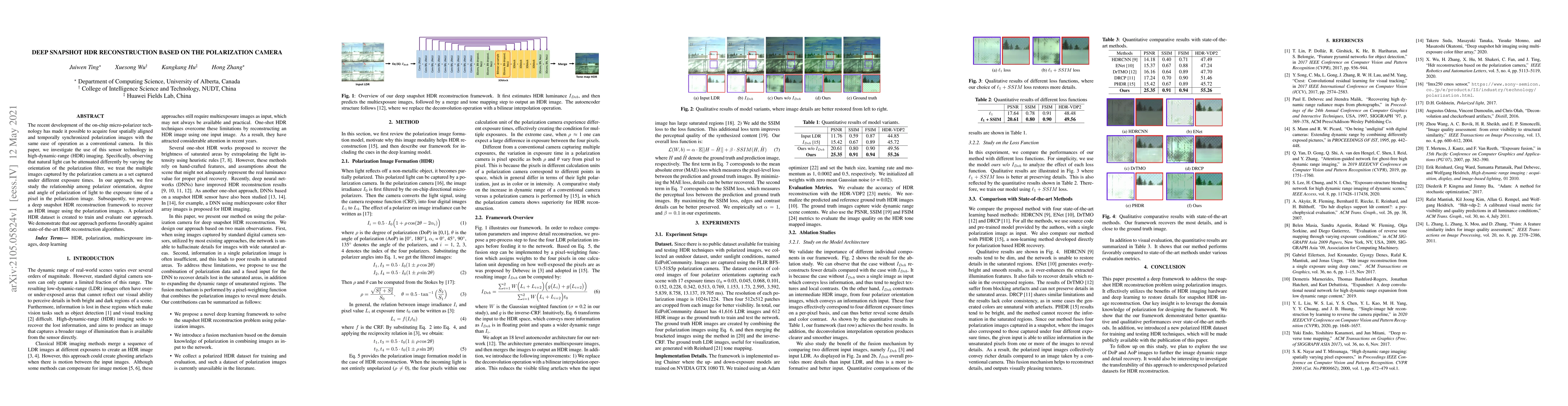 The paper presents a deep snapshot HDR reconstruction framework based on polarization images, incorporating an autoencoder architecture with linear interpolation for improved detail reconstruction and a pixel-weighting function based on the polarization image formation model.