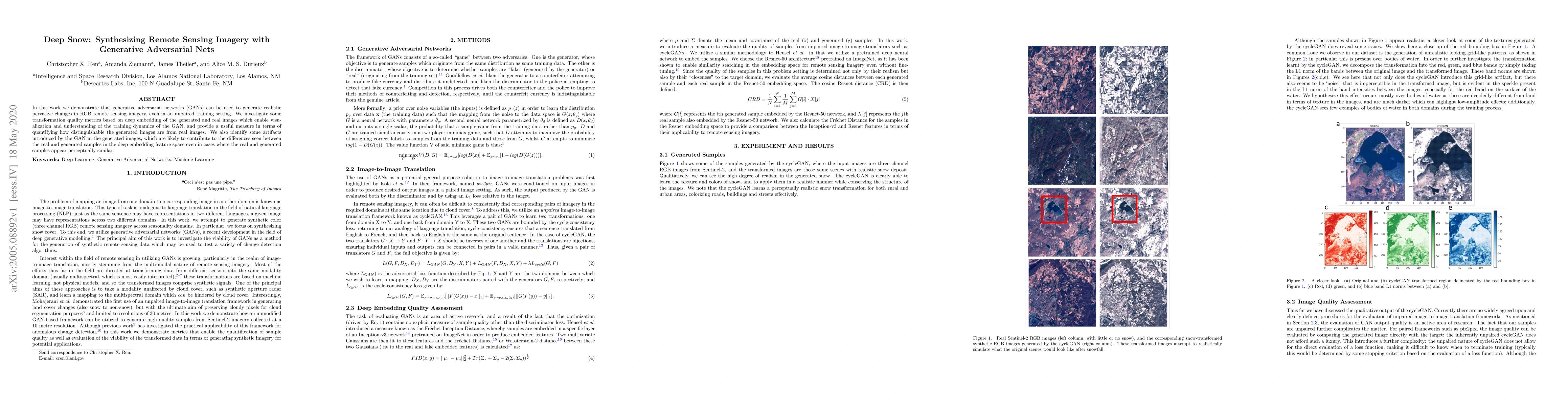 This paper explores the use of generative adversarial networks (GANs) to create realistic transformations in remote sensing imagery without paired training data. It introduces metrics based on deep embeddings to assess transformation quality and identifies artifacts in generated images that affect their distinguishability from real samples.