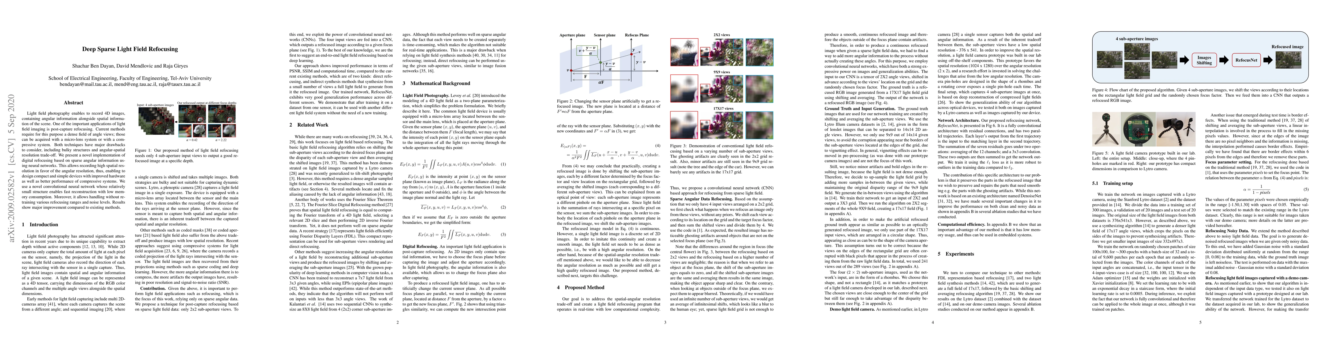 Light field photography enables to record 4D images, containing angular information alongside spatial information of the scene. One of the important applications of light field imaging is post-capture refocusing. Current methods require for this purpose a dense field of angle views; those can be acquired with a micro-lens system or with a compressive system. Both techniques have major drawbacks to consider, including bulky structures and angular-spatial resolution trade-off. We present a novel implementation of digital refocusing based on sparse angular information using neural networks. This allows recording high spatial resolution in favor of the angular resolution, thus, enabling to design compact and simple devices with improved hardware as well as better performance of compressive systems. We use a novel convolutional neural network whose relatively small structure enables fast reconstruction with low memory consumption. Moreover, it allows handling without re-training various refocusing ranges and noise levels. Results show major improvement compared to existing methods.
