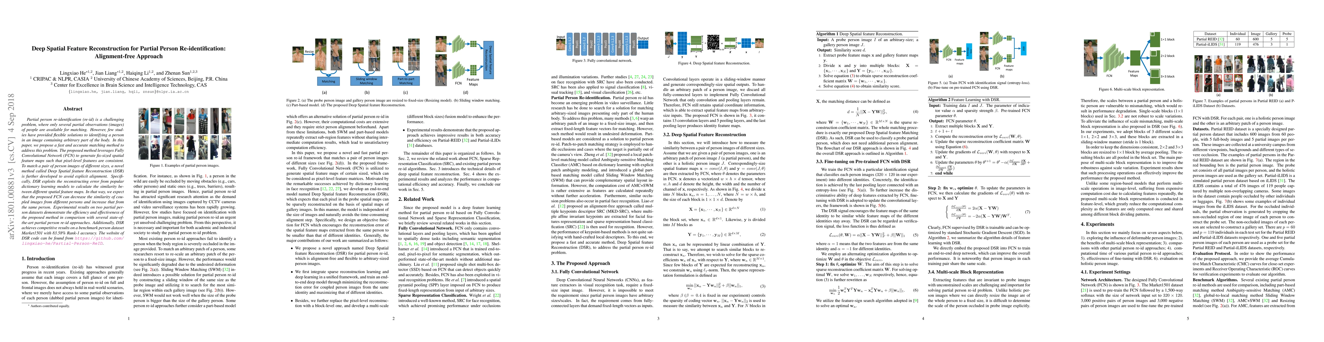 This paper proposes a method for partial person re-identification using a Fully Convolutional Network (FCN) for spatial feature maps and a Deep Spatial feature Reconstruction (DSR) technique to match images without explicit alignment, achieving competitive accuracy on benchmark datasets. Experimental results show the method's efficiency and effectiveness compared to state-of-the-art approaches.