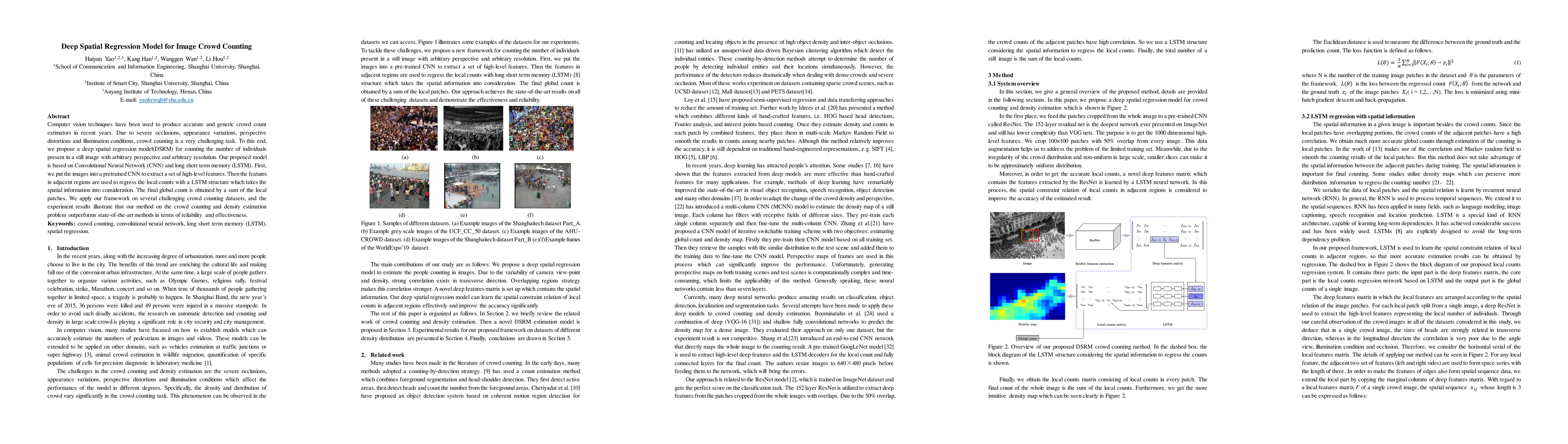 This paper proposes a deep spatial regression model (DSRM) combining CNN and LSTM to accurately count individuals in crowd scenes, addressing challenges like occlusions and perspective distortions. Experiments show DSRM outperforms existing methods in crowd counting and density estimation.