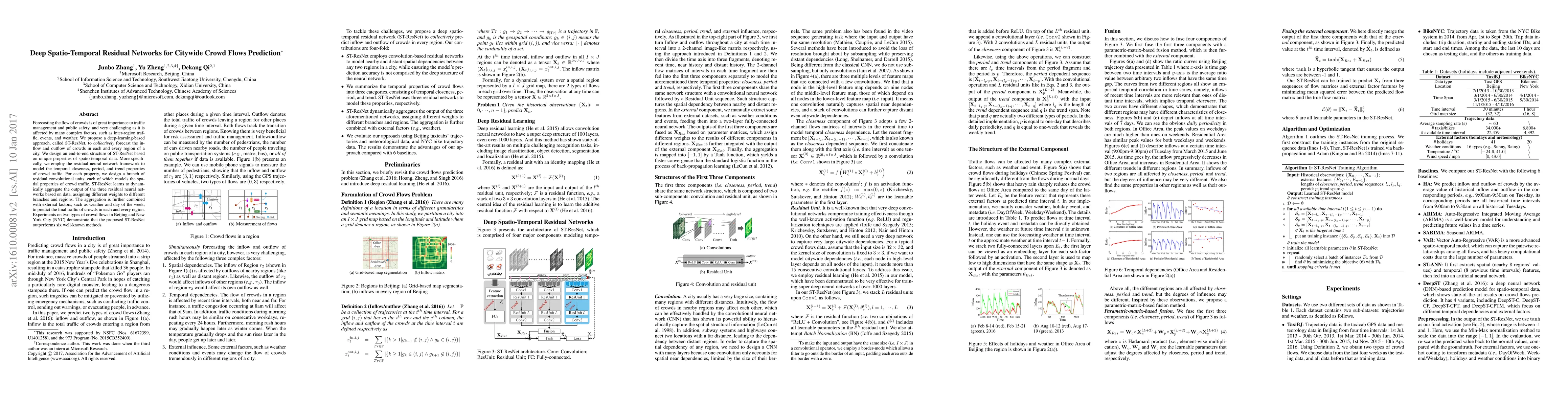 This paper proposes ST-ResNet, a deep-learning model for citywide crowd flow prediction, leveraging residual networks to capture temporal and spatial properties. The model dynamically aggregates outputs from three branches, incorporating external factors, and outperforms six other methods in forecasting crowd flows in Beijing and NYC.