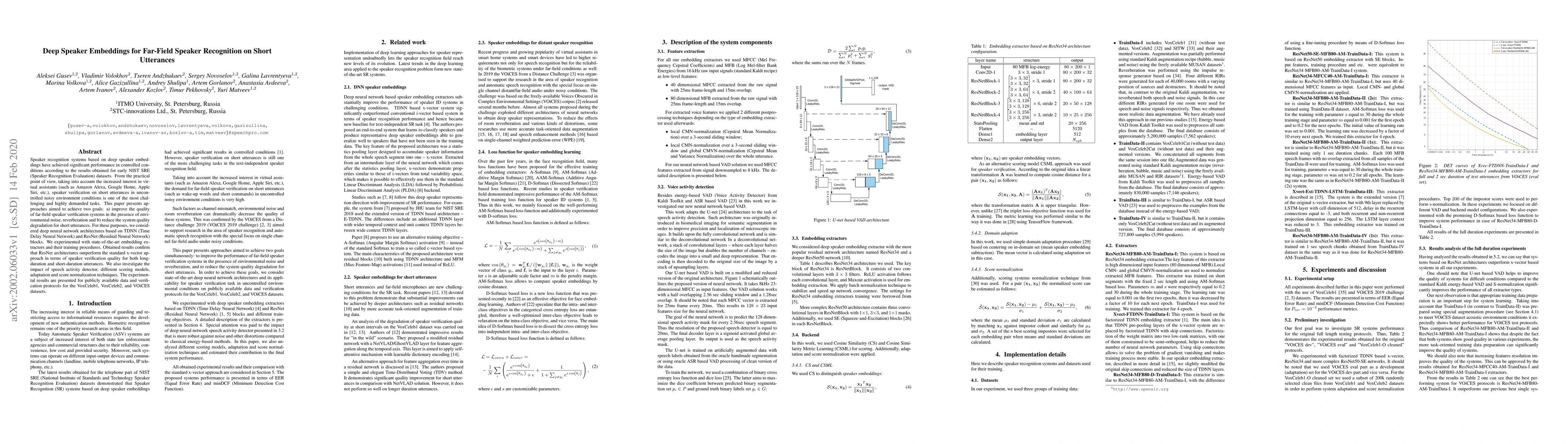 Speaker recognition systems based on deep speaker embeddings have achieved significant performance in controlled conditions according to the results obtained for early NIST SRE (Speaker Recognition Evaluation) datasets. From the practical point of view, taking into account the increased interest in virtual assistants (such as Amazon Alexa, Google Home, AppleSiri, etc.), speaker verification on short utterances in uncontrolled noisy environment conditions is one of the most challenging and highly demanded tasks. This paper presents approaches aimed to achieve two goals: a) improve the quality of far-field speaker verification systems in the presence of environmental noise, reverberation and b) reduce the system qualitydegradation for short utterances. For these purposes, we considered deep neural network architectures based on TDNN (TimeDelay Neural Network) and ResNet (Residual Neural Network) blocks. We experimented with state-of-the-art embedding extractors and their training procedures. Obtained results confirm that ResNet architectures outperform the standard x-vector approach in terms of speaker verification quality for both long-duration and short-duration utterances. We also investigate the impact of speech activity detector, different scoring models, adaptation and score normalization techniques. The experimental results are presented for publicly available data and verification protocols for the VoxCeleb1, VoxCeleb2, and VOiCES datasets.