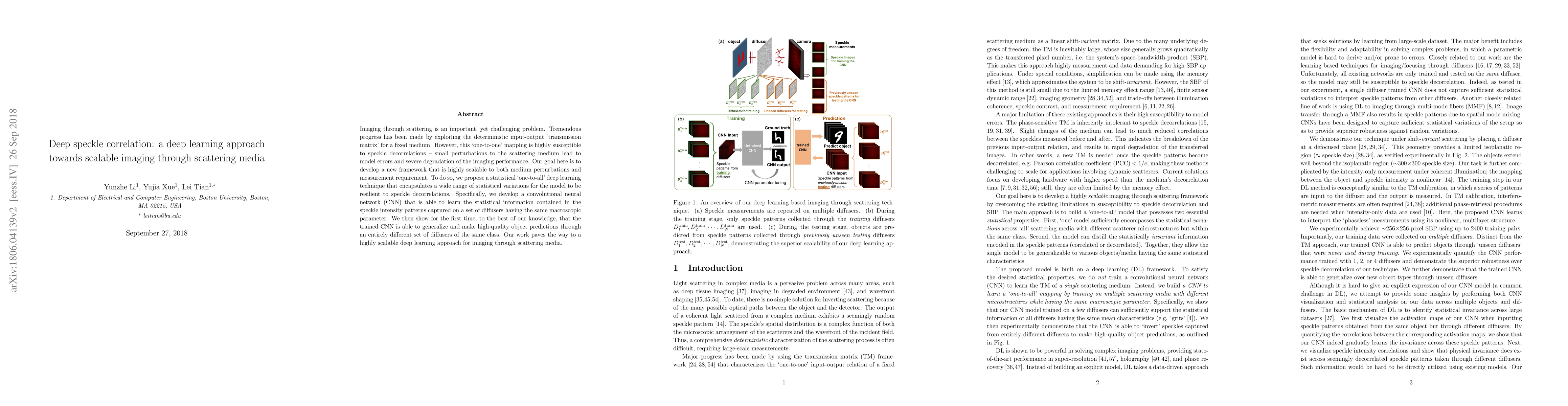 This paper proposes a deep learning framework using convolutional neural networks to address the challenge of imaging through scattering media, focusing on developing a scalable "one-to-all" model that can generalize across different scattering conditions and resist speckle decorrelations. The trained CNN demonstrates high-quality object predictions across various diffusers, indicating a promising scalable approach for such imaging tasks.