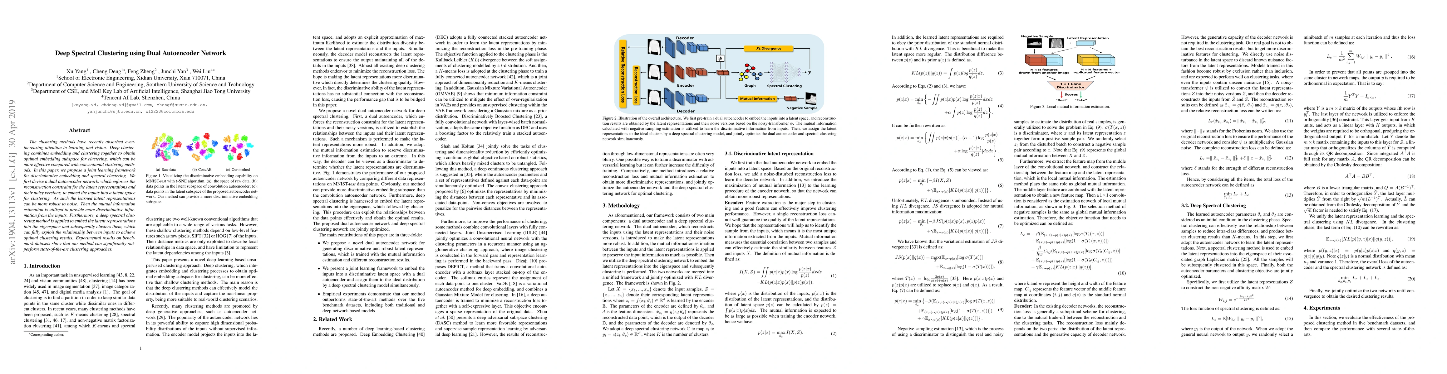 This paper proposes a joint learning framework using a dual autoencoder network for deep spectral clustering, combining embedding and clustering to achieve optimal clustering results. The method embeds inputs into a robust latent space and utilizes deep spectral clustering to exploit input relationships, outperforming state-of-the-art clustering approaches on benchmark datasets.