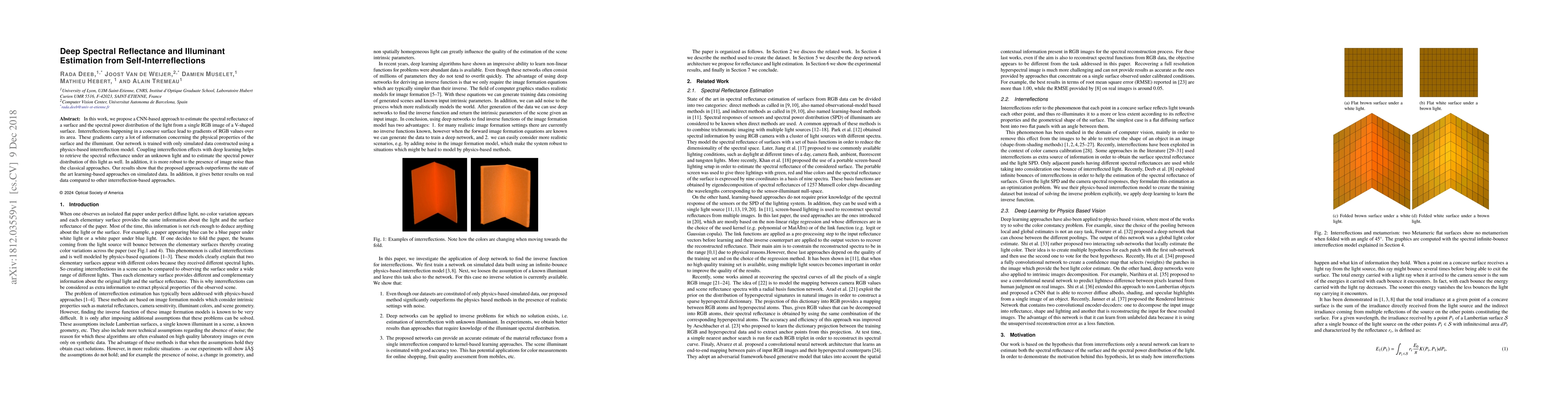 In this work, we propose a CNN-based approach to estimate the spectral reflectance of a surface and the spectral power distribution of the light from a single RGB image of a V-shaped surface. Interreflections happening in a concave surface lead to gradients of RGB values over its area. These gradients carry a lot of information concerning the physical properties of the surface and the illuminant. Our network is trained with only simulated data constructed using a physics-based interreflection model. Coupling interreflection effects with deep learning helps to retrieve the spectral reflectance under an unknown light and to estimate the spectral power distribution of this light as well. In addition, it is more robust to the presence of image noise than the classical approaches. Our results show that the proposed approach outperforms the state of the art learning-based approaches on simulated data. In addition, it gives better results on real data compared to other interreflection-based approaches.