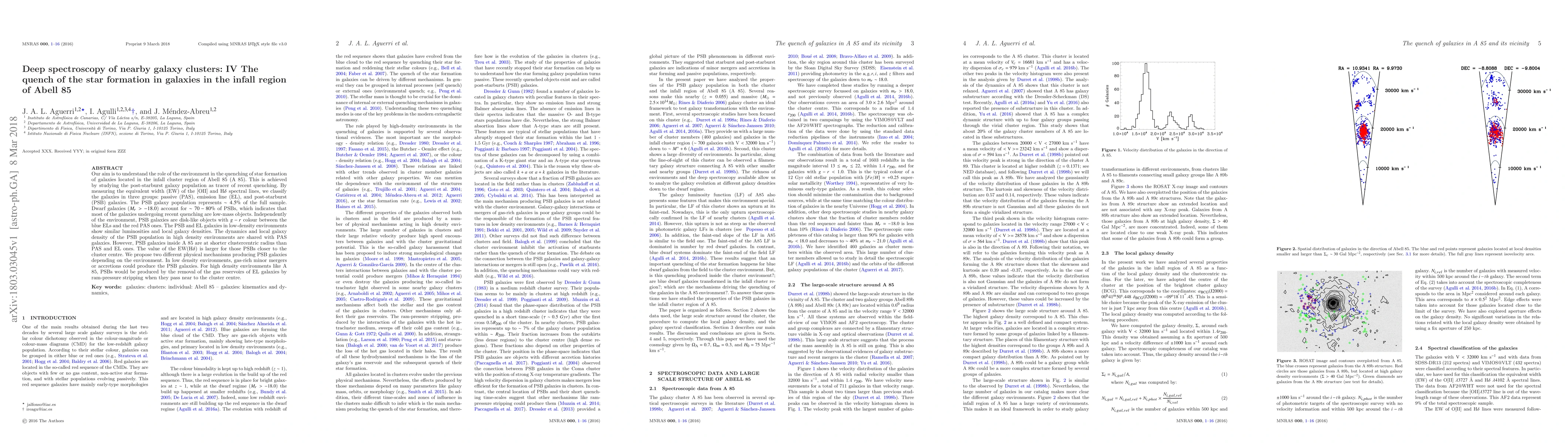 Our aim is to understand the role of the environment in the quenching of star formation of galaxies located in the infall cluster region of Abell 85 (A85). This is achieved by studying the post-starburst galaxy population as tracer of recent quenching. By measuring the equivalent width (EW) of the [OII] and Hdelta spectral lines, we classify the galaxies in three groups: passive (PAS), emission line (EL), and post-starburst (PSB) galaxies. The PSB galaxy population represents about 4.5% of the full sample. Dwarf galaxies (Mr > -18.0) account for about 70 - 80% of PSBs, which indicates that most of the galaxies undergoing recent quenching are low-mass objects. Independently of the environment, PSB galaxies are disk-like objects with g - r colour between the blue ELs and the red PAS ones. The PSB and EL galaxies in low-density environments show similar luminosities and local galaxy densities. The dynamics and local galaxy density of the PSB population in high density environments are shared with PAS galaxies. However, PSB galaxies inside A85 are at shorter clustercentric radius than PAS and EL ones. The value of the EW(Hdelta) is larger for those PSBs closer to the cluster centre. We propose two different physical mechanisms producing PSB galaxies depending on the environment. In low density environments, gas-rich minor mergers or accretions could produce the PSB galaxies. For high density environments like A85, PSBs would be produced by the removal of the gas reservoirs of EL galaxies by ram-pressure stripping when they pass near to the cluster centre.