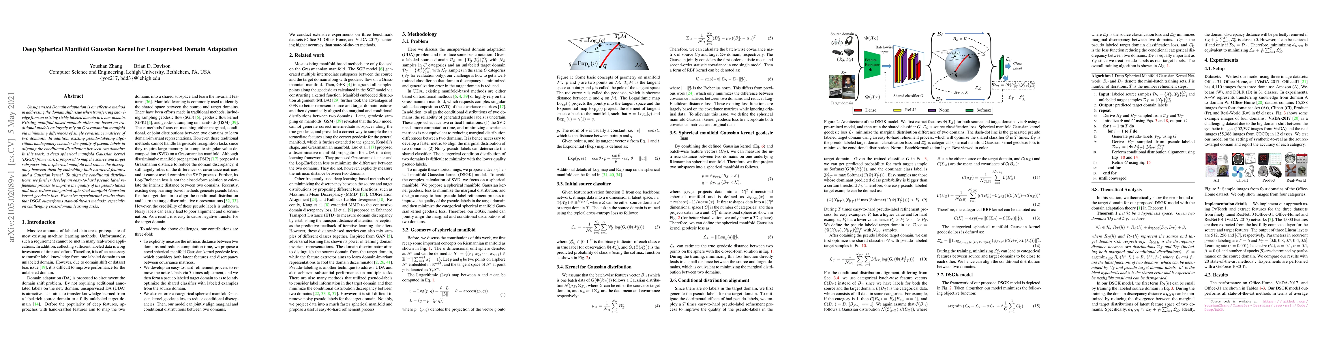 This paper introduces a Deep Spherical Manifold Gaussian Kernel (DSGK) framework for unsupervised domain adaptation, aiming to reduce domain shift by mapping source and target features onto a spherical manifold and improving pseudo label quality to better align conditional distributions. Experimental results demonstrate DSGK's superior performance over existing methods.