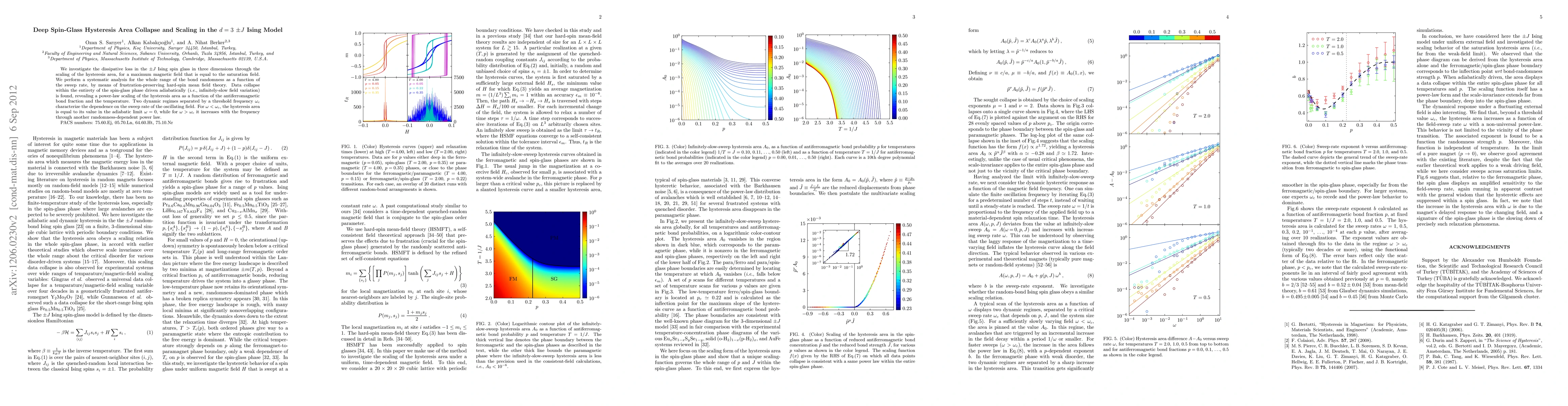 We investigate the dissipative loss in the $\pm J$ Ising spin glass in three dimensions through the scaling of the hysteresis area, for a maximum magnetic field that is equal to the saturation field. We perform a systematic analysis for the whole range of the bond randomness as a function of the sweep rate, by means of frustration-preserving hard-spin mean field theory. Data collapse within the entirety of the spin-glass phase driven adiabatically (i.e., infinitely-slow field variation) is found, revealing a power-law scaling of the hysteresis area as a function of the antiferromagnetic bond fraction and the temperature. Two dynamic regimes separated by a threshold frequency $\omega_c$ characterize the dependence on the sweep rate of the oscillating field. For $\omega < \omega_c$, the hysteresis area is equal to its value in the adiabatic limit $\omega = 0$, while for $\omega > \omega_c$ it increases with the frequency through another randomness-dependent power law.
