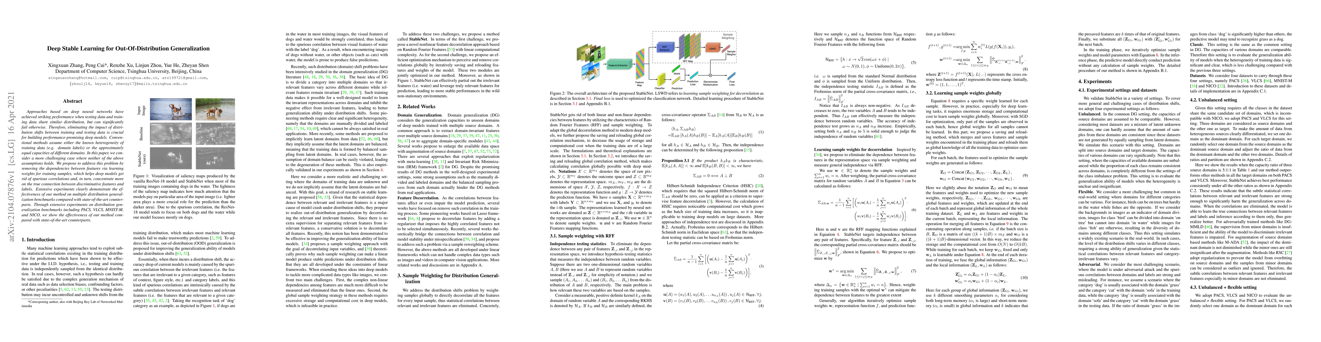 Approaches based on deep neural networks have achieved striking performance when testing data and training data share similar distribution, but can significantly fail otherwise. Therefore, eliminating the impact of distribution shifts between training and testing data is crucial for building performance-promising deep models. Conventional methods assume either the known heterogeneity of training data (e.g. domain labels) or the approximately equal capacities of different domains. In this paper, we consider a more challenging case where neither of the above assumptions holds. We propose to address this problem by removing the dependencies between features via learning weights for training samples, which helps deep models get rid of spurious correlations and, in turn, concentrate more on the true connection between discriminative features and labels. Extensive experiments clearly demonstrate the effectiveness of our method on multiple distribution generalization benchmarks compared with state-of-the-art counterparts. Through extensive experiments on distribution generalization benchmarks including PACS, VLCS, MNIST-M, and NICO, we show the effectiveness of our method compared with state-of-the-art counterparts.