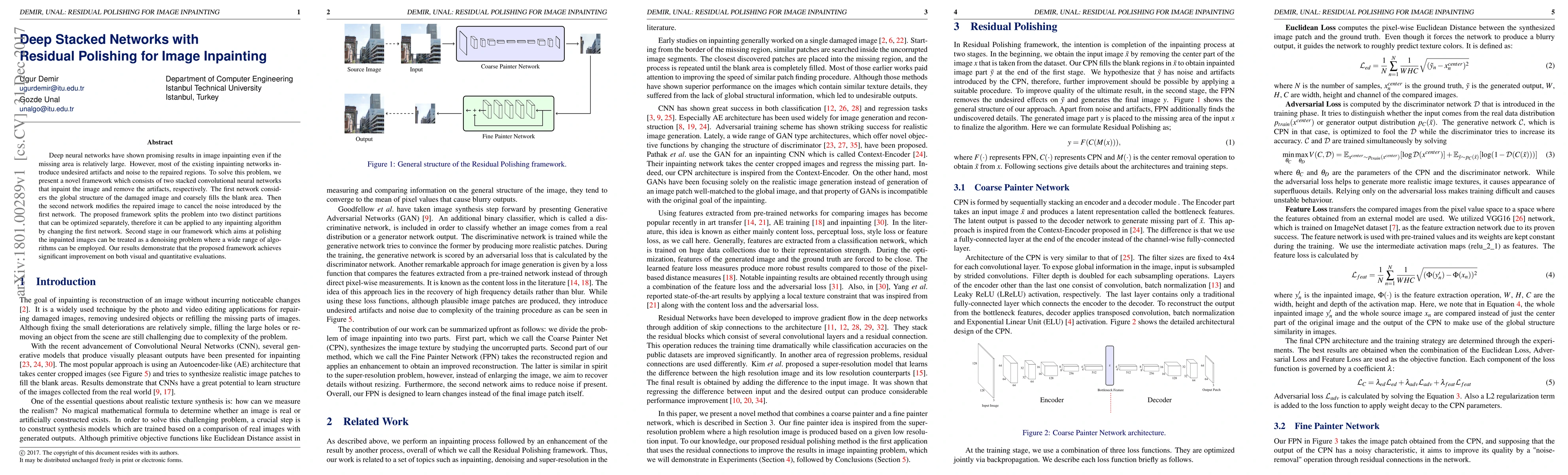 Deep neural networks have shown promising results in image inpainting even if the missing area is relatively large. However, most of the existing inpainting networks introduce undesired artifacts and noise to the repaired regions. To solve this problem, we present a novel framework which consists of two stacked convolutional neural networks that inpaint the image and remove the artifacts, respectively. The first network considers the global structure of the damaged image and coarsely fills the blank area. Then the second network modifies the repaired image to cancel the noise introduced by the first network. The proposed framework splits the problem into two distinct partitions that can be optimized separately, therefore it can be applied to any inpainting algorithm by changing the first network. Second stage in our framework which aims at polishing the inpainted images can be treated as a denoising problem where a wide range of algorithms can be employed. Our results demonstrate that the proposed framework achieves significant improvement on both visual and quantitative evaluations.