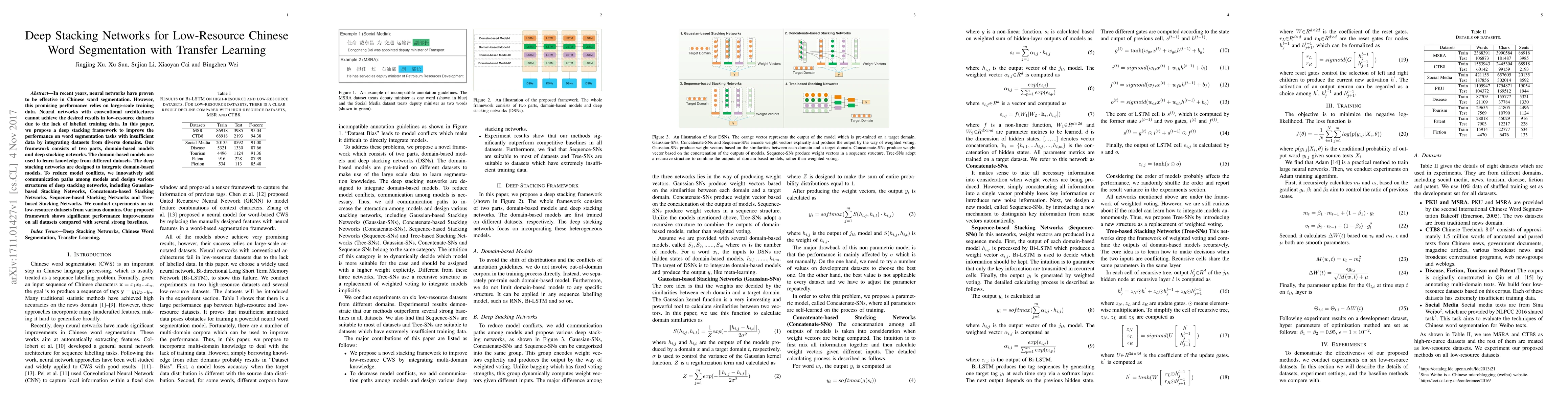 The paper proposes a deep stacking framework for low-resource Chinese word segmentation using transfer learning. It integrates diverse domain datasets through domain-based models and deep stacking networks, including Gaussian-based, Concatenate-based, Sequence-based, and Tree-based Stacking Networks, to reduce model conflicts.